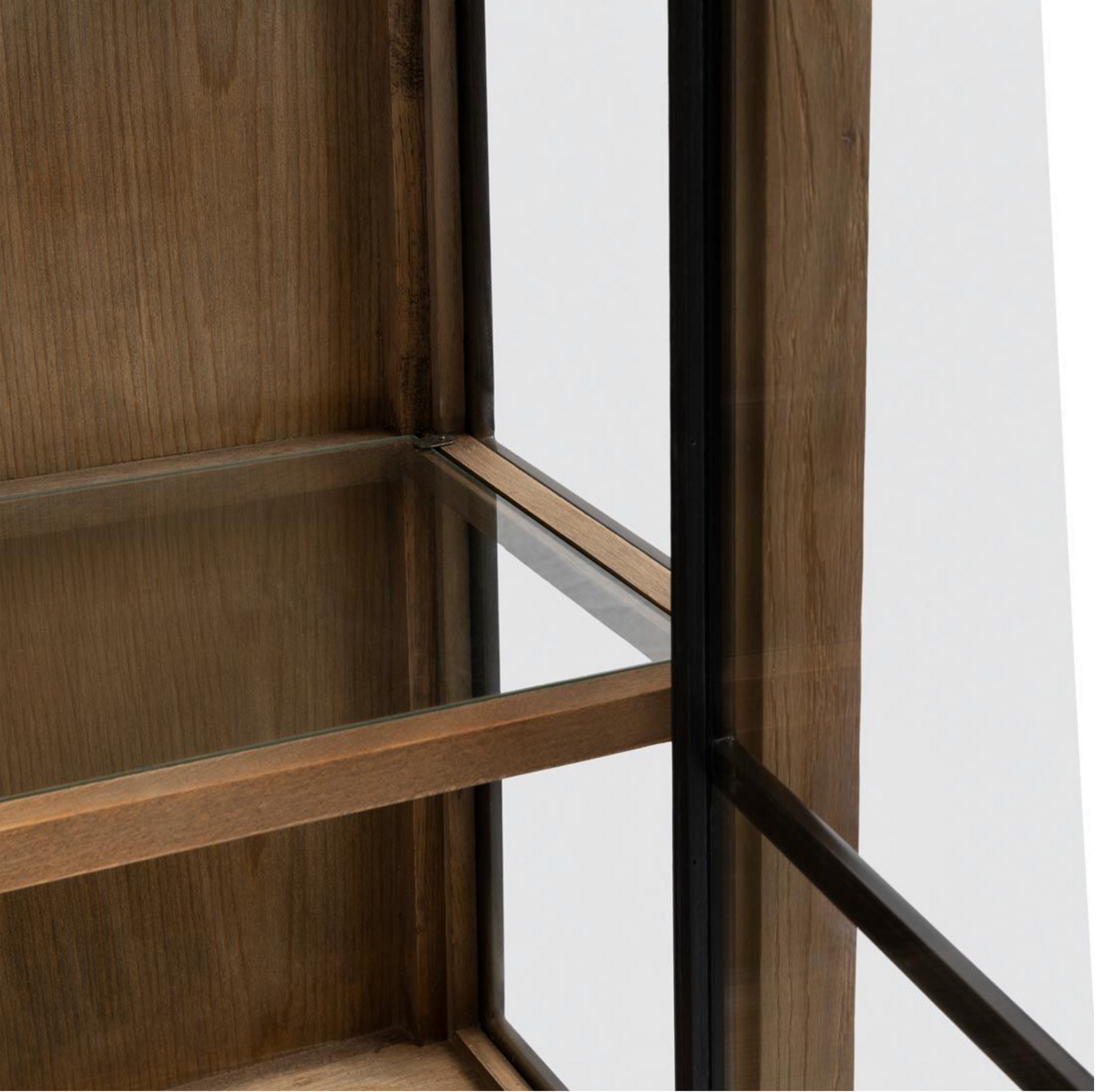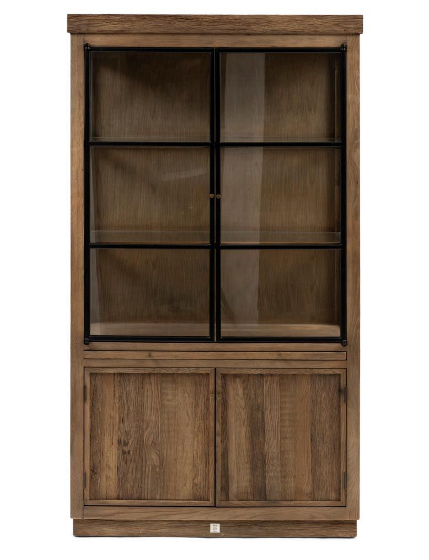 Le cabinet Clearwater Creek par Riviera Maison est la preuve des possibilités de production durable, car ce cabinet est fait de vieux chêne recyclé. L'armoire est une pièce, mais avec des portes en placard en dessous et une assiette avec des portes en verre dans un cadre stable en métal noir.