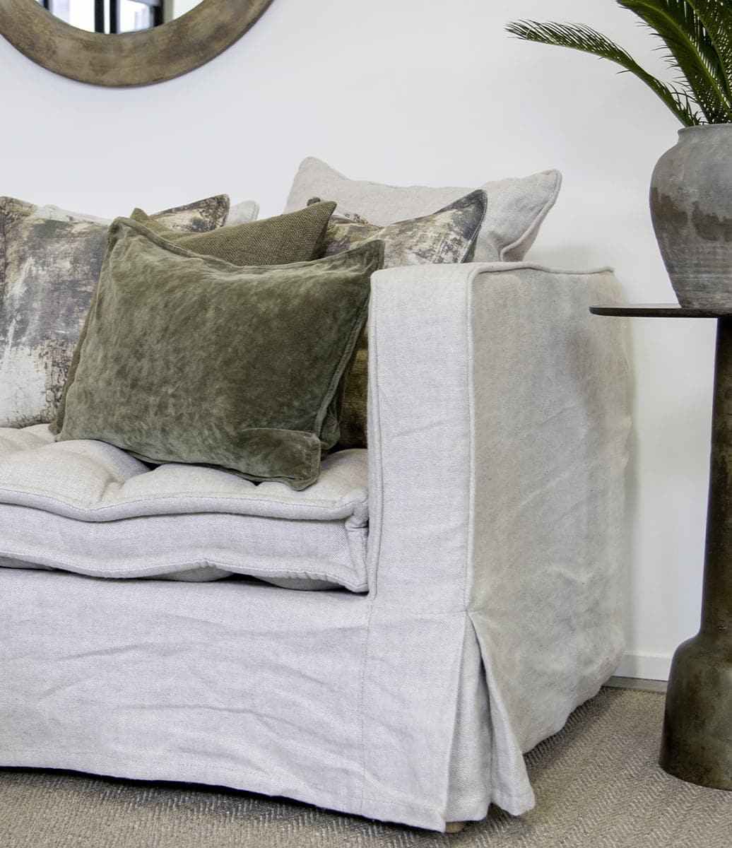 Dimensioni e colori disponibili: Il divano Greenwich in sabbia di lino è disponibile come 2,5 posti e 3 posti. Inoltre, il divano come 3 posti è disponibile anche nel grigio in ferro di velluto a colori.