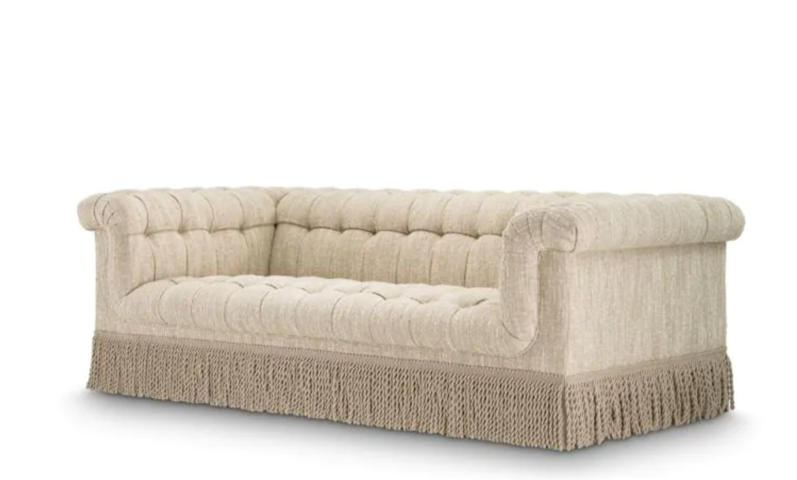 De bank Dorantes van Eichholtz In een luxueuze bouclé -stoffen sonate crème combineert tijdloos ontwerp met modern comfort. Met een breedte van 236 cm en een stoelhoogte van 46 cm biedt deze bank een perfecte elegantie voor woonkamer of lounge. Het geurige vakmanschap en de elegante franjes geven elke kamer een vleugje luxe.