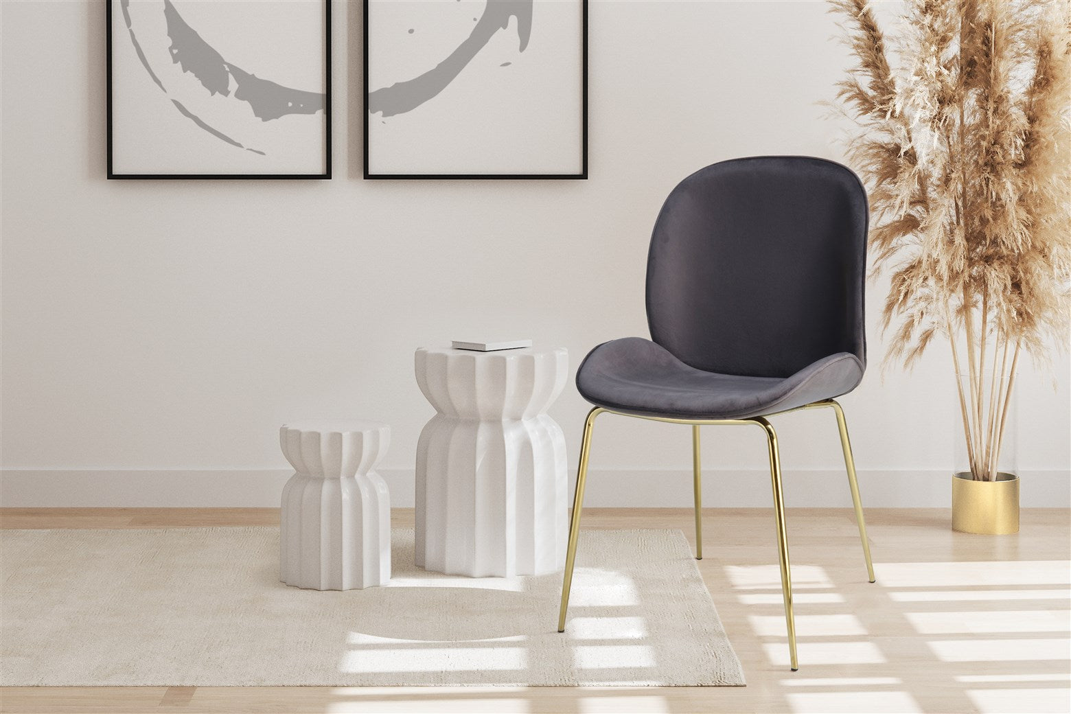 De eetkamer Hanny fascineert met zijn zachte, altrosa -gekleurde stoffenhoes en de elegante messing -gekleurde poten -een perfect duo voor stijlvolle accenten in elke kamer.