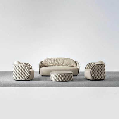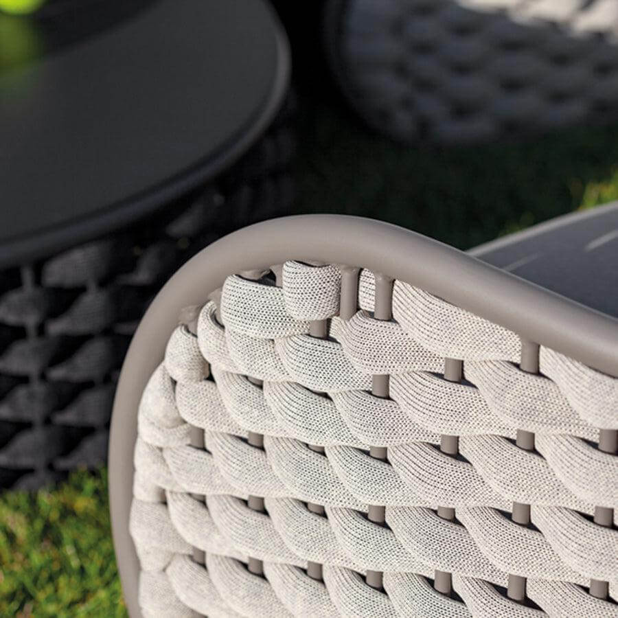 De Grattoni Mojo is een hoogwaardige loungeset voor buitengebruik in de horeca en het hotelwezen. Hij bestaat uit een 2-zitsbank, twee tuinfauteuils en een tuintafel met aluminium blad. De duurzame textielbekleding en het touwweefsel (rubber touw) geven het geheel een verfijnde uitstraling. De gestoffeerde kussens zijn bekleed met acrylstof.