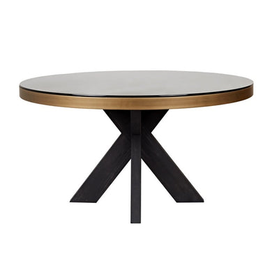 De eettafel Bloomville van Richmond Interiors, met een diameter van 140 cm, combineert moderne elegantie met functionaliteit. Gemaakt van ijzer, PU-leer en veiligheidsglas, deze tafel biedt een nobel oppervlak en is een opvallende.