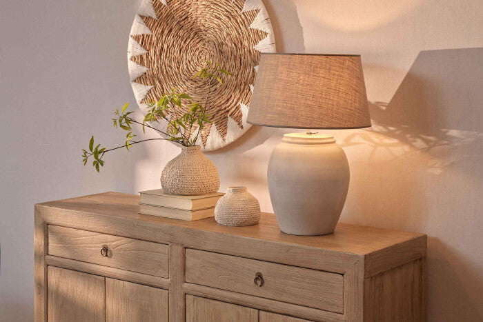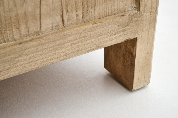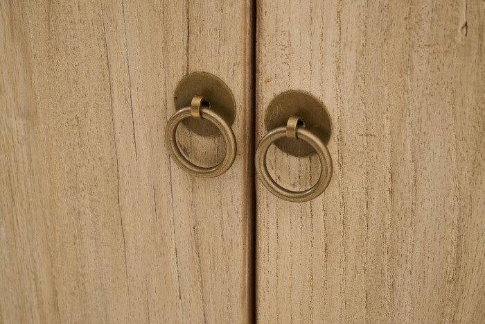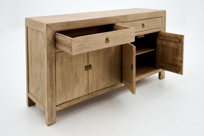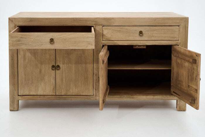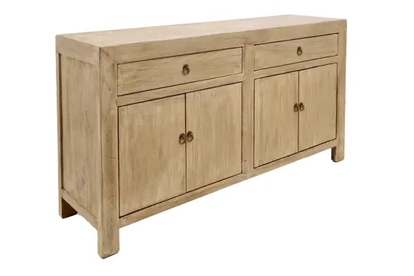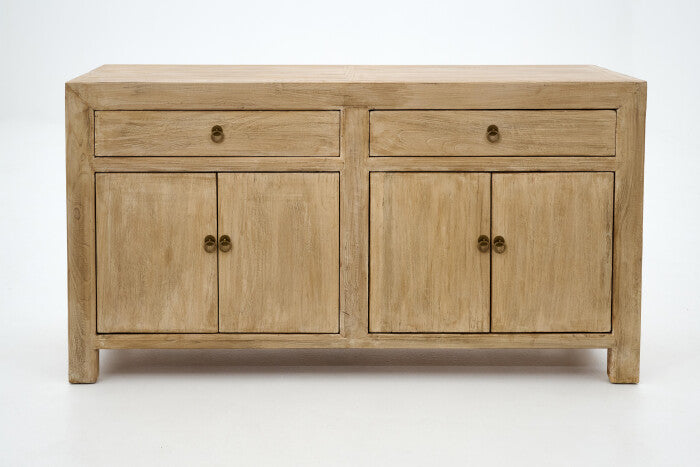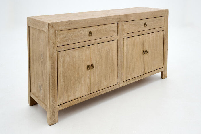 The Flamant Szafka bufetowa LIBBY zachwyca uroczym designem w naturalnym odcieniu drewna i wysokiej jakości wykonaniem z litego wiązu. Dzięki czterem drzwiom i dwóm szufladom oferuje dużo miejsca do przechowywania naczyń, szklanek i akcesoriów domowych. Wyraźne linie i delikatne usłojenie sprawiają, że jest to stylowy element przyciągający wzrok w każdym wnętrzu - czy to w salonie, jadalni czy przedpokoju. Metalowe uchwyty harmonijnie uzupełniają elegancki całościowy obraz. Idealny dla każdego, kto szuka ponadczasowych mebli z charakterem.