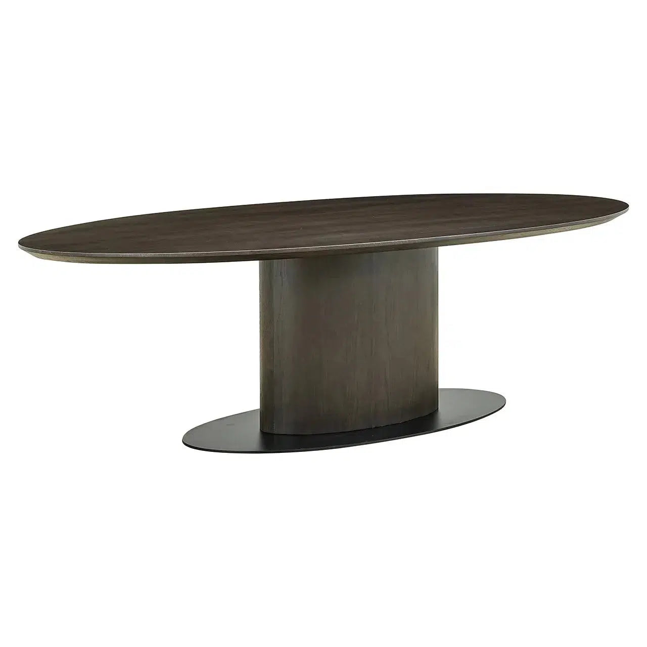 - Projekt i styl: Nowoczesny, minimalistyczny stół jadalny z owalistyczną górą i solidną kolumną środkową