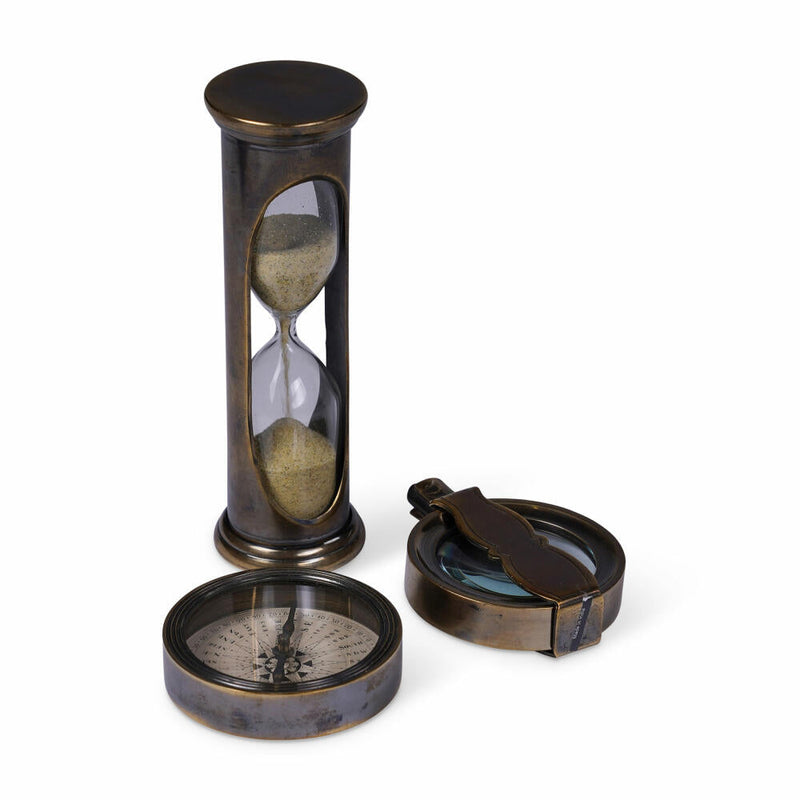 Die Geschenkbox von Authentic Models enthält einen Polaris-Kompass, eine 1.5-Minuten-Sanduhr aus Messing und eine Vintage-Reiselupe.