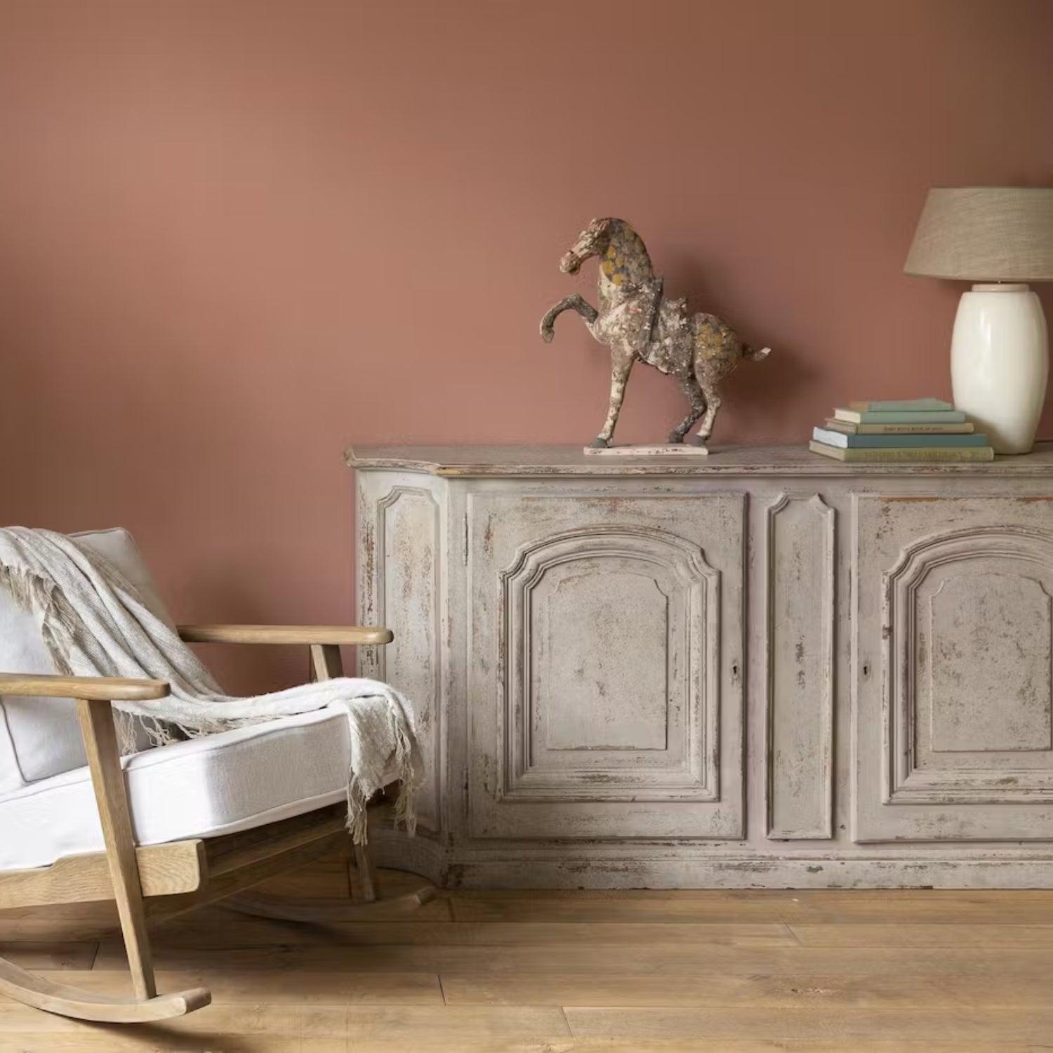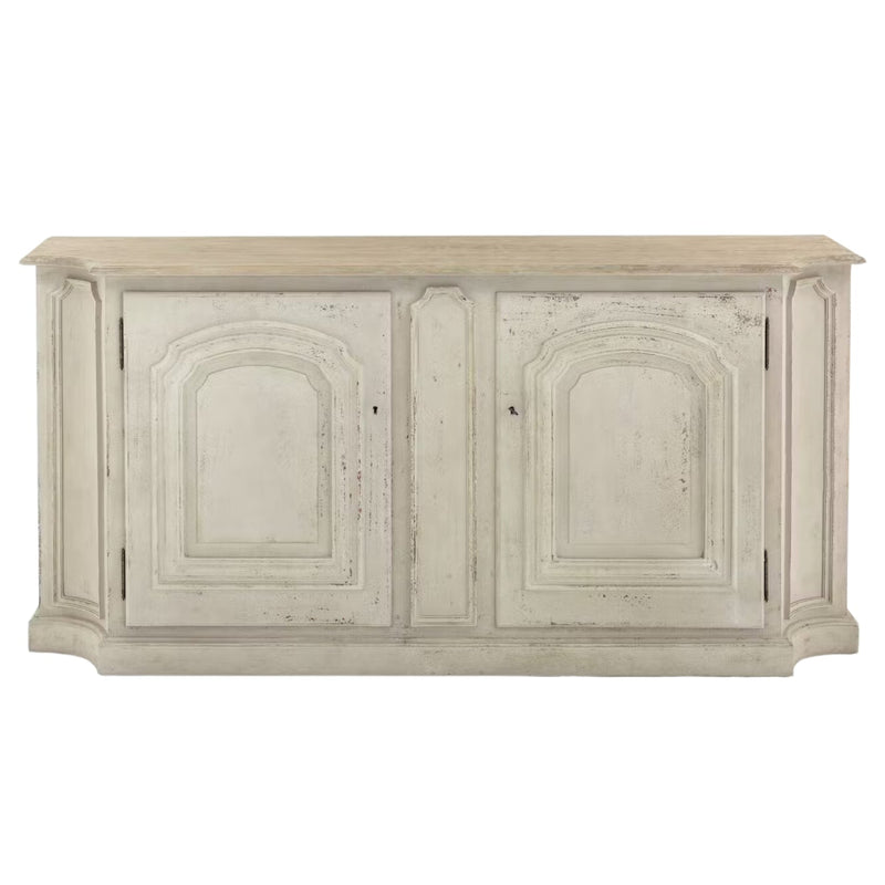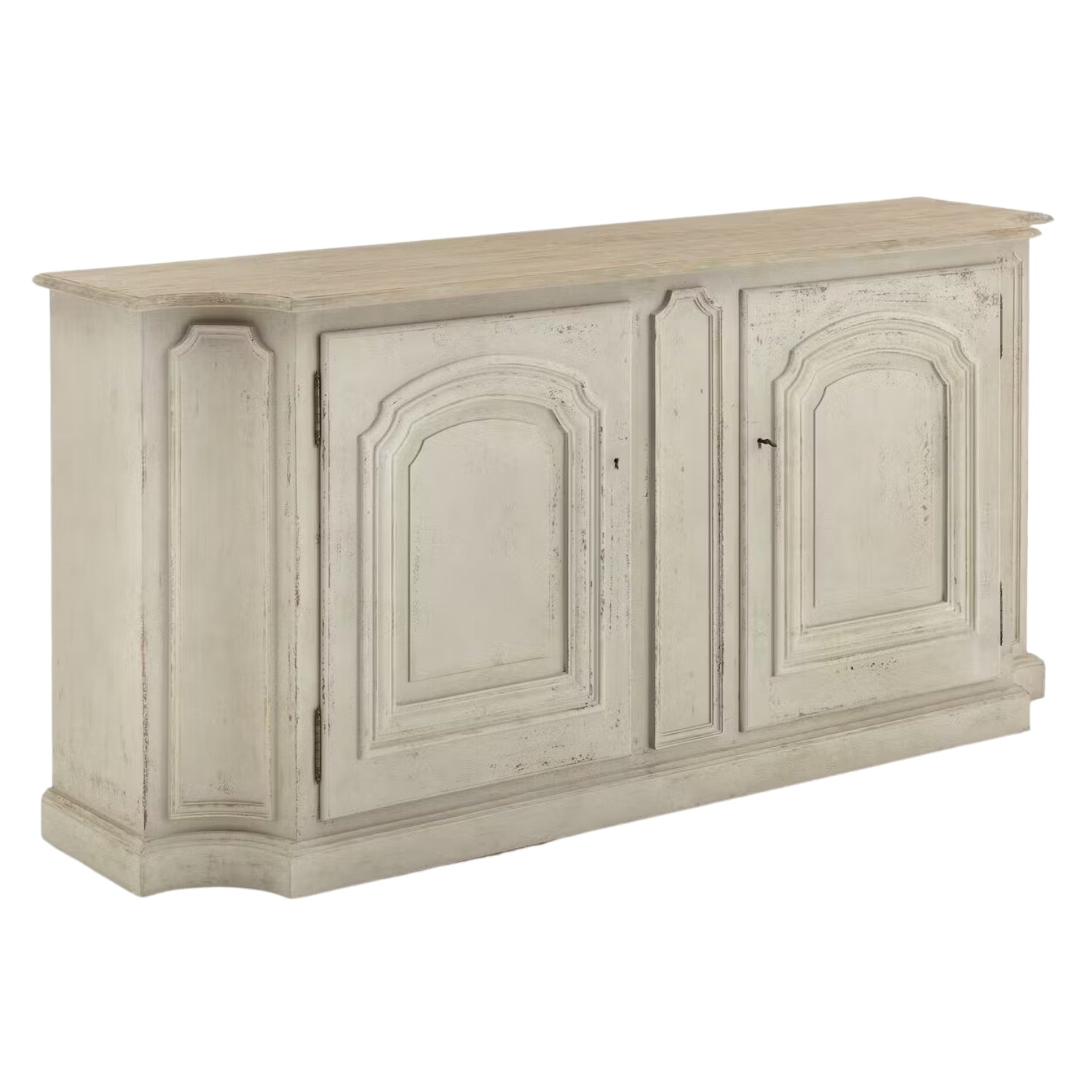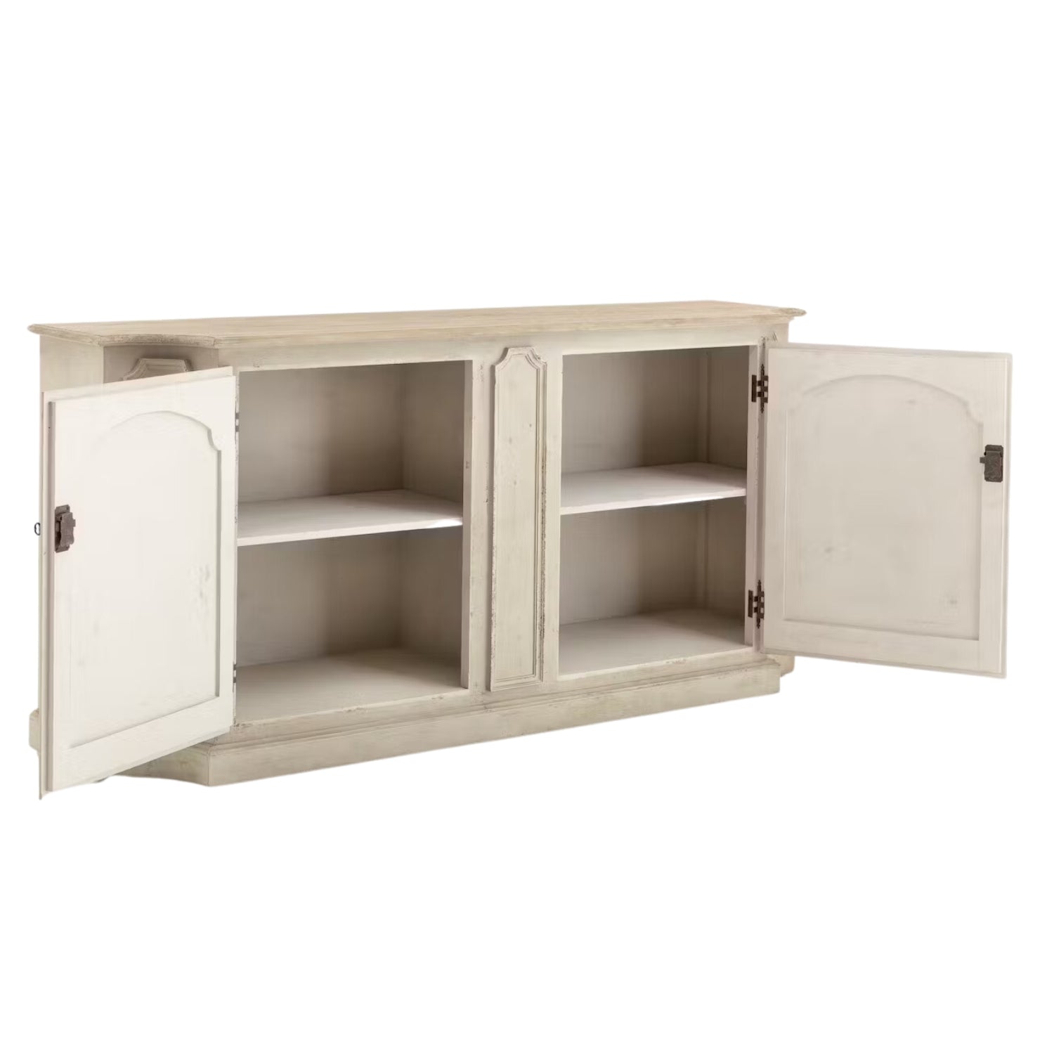 Amaris ist eine große Kredenz, die weiß gestrichen und für einen einzigartigen Antiklook sorgfältig von Hand bearbeitet wurde, sodass die reiche Maserung unter der robusten Lackschicht durchschimmert. Das Stück wurde nach einem gustavianischen Muster entworfen und seine raue Patina erinnert an die skandinavischen Antiquitäten des späten 18. Jahrhunderts. Der Schrank ist mit einer in Handarbeit hergestellten Verkleidung dekoriert, die sich auf der Innenseite der Türen wiederfindet.