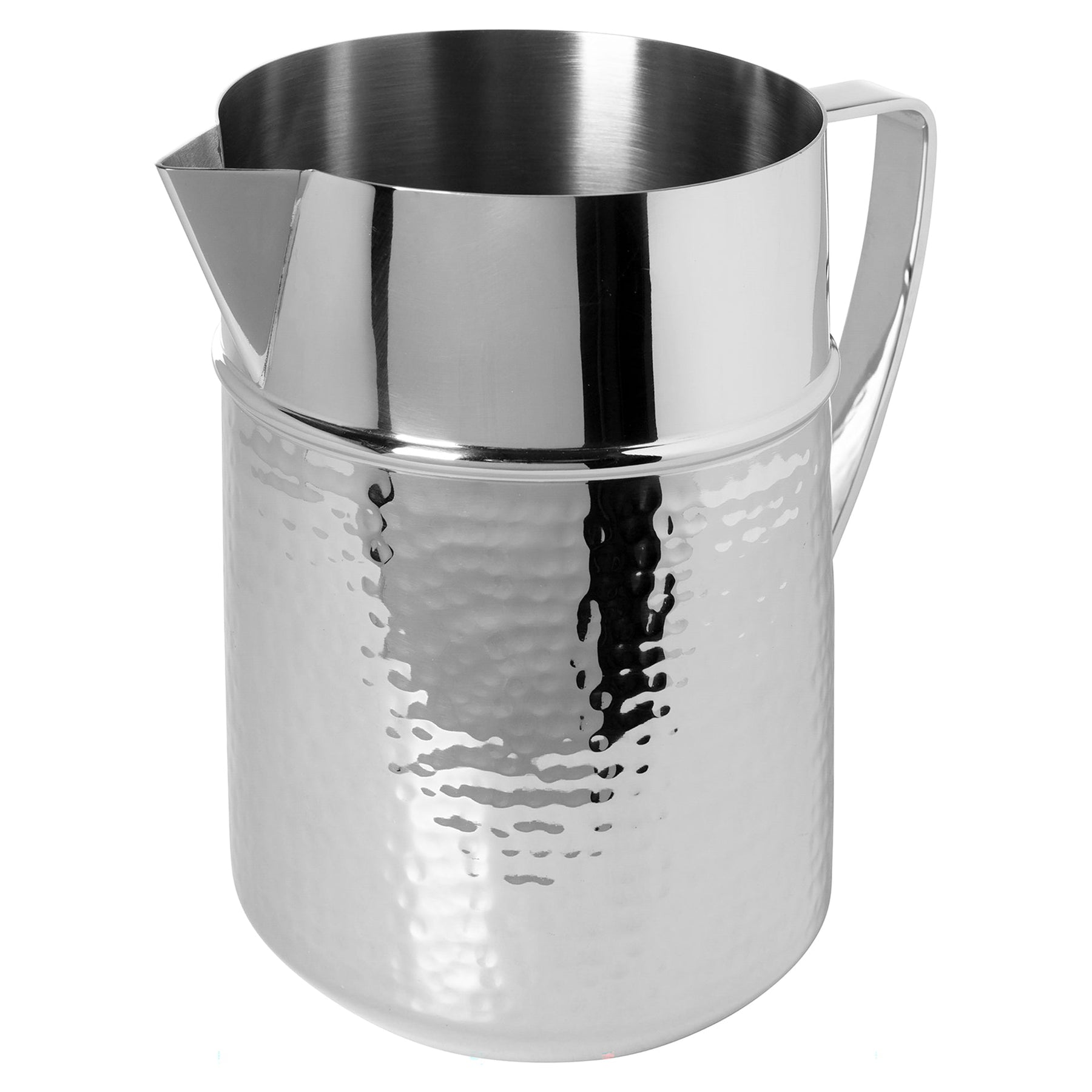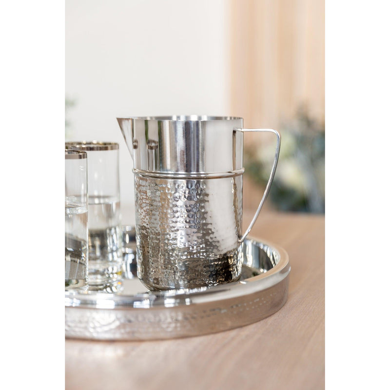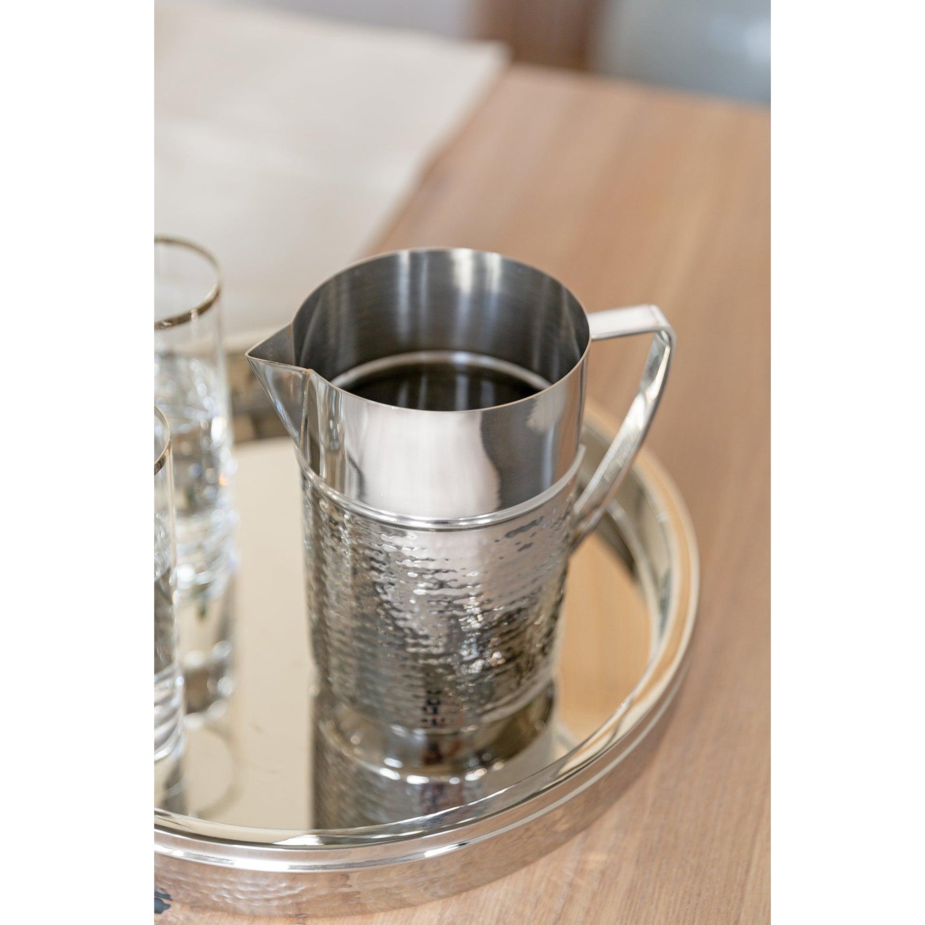 Der Wasserkrug NASSAU ergänzt die gleichnamige Serie um ein weiteres Accessoire für gepflegte Tischkultur und bedient höchste Stil- und Qualitätsansprüche. Er verfügt über ein Fassungsvermögen von 1,5 Litern und ist aus lebensmittelechtem und pflegeleichtem Edelstahl gefertigt. Das unkompliziert zeitlose Design und der Kontrast zwischen der glatten Oberfläche und der feinen Hammerschlagstruktur machen den Krug zu einem gekonnten Akzent auf jedem gedeckten Tisch. Jedes einzelne Stück wird in aufwendiger, traditioneller Handarbeit gefertigt und es entstehen individuelle Unikate, die ihre ganz eigene Herstellungsgeschichte besitzen.