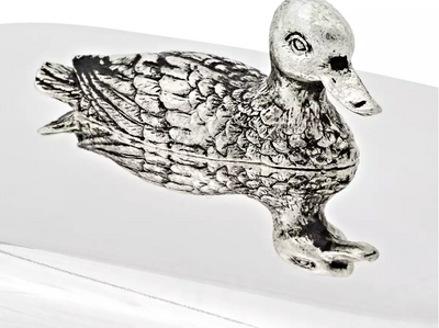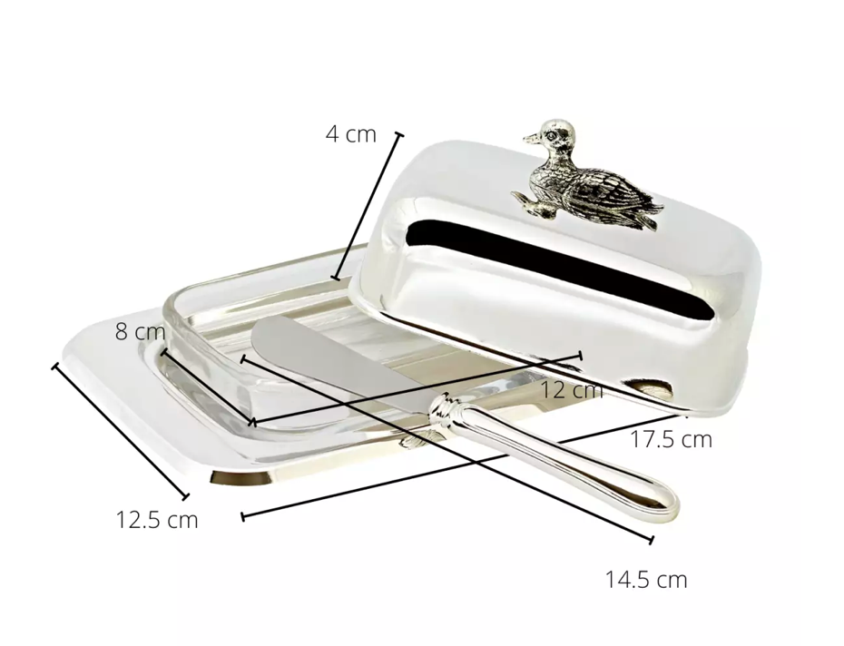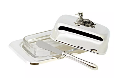 Edzard Butterdose Ente (250 g Butter), Enten-Figur, edel versilbert, mit Glasschale und Buttermesser