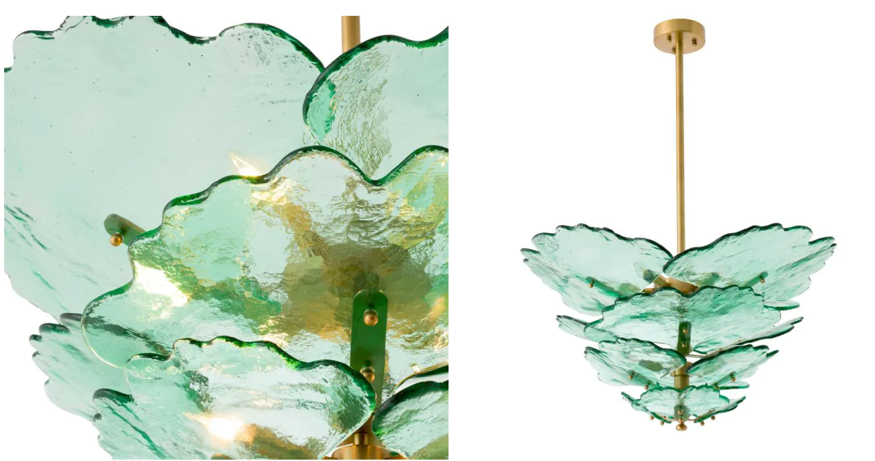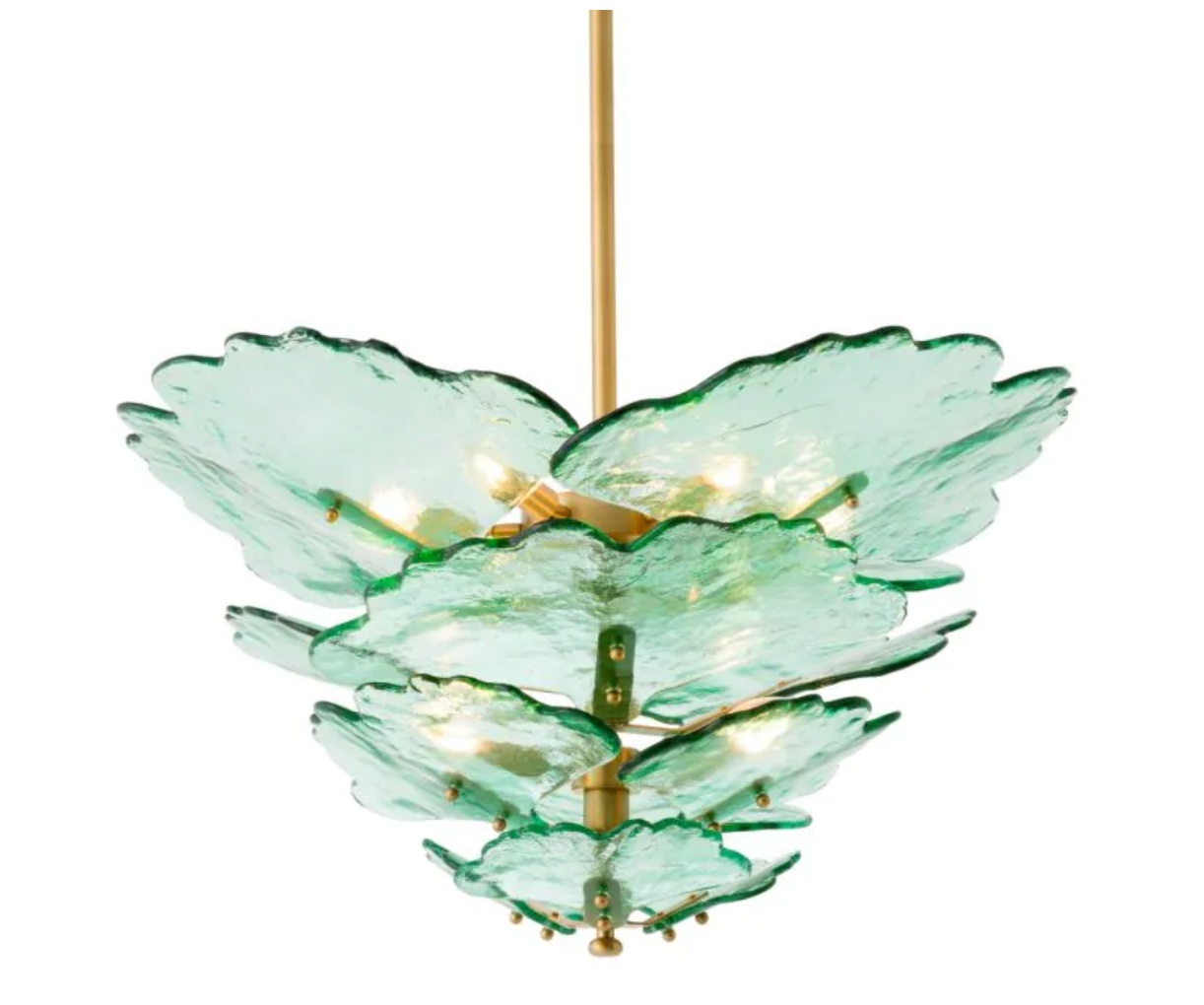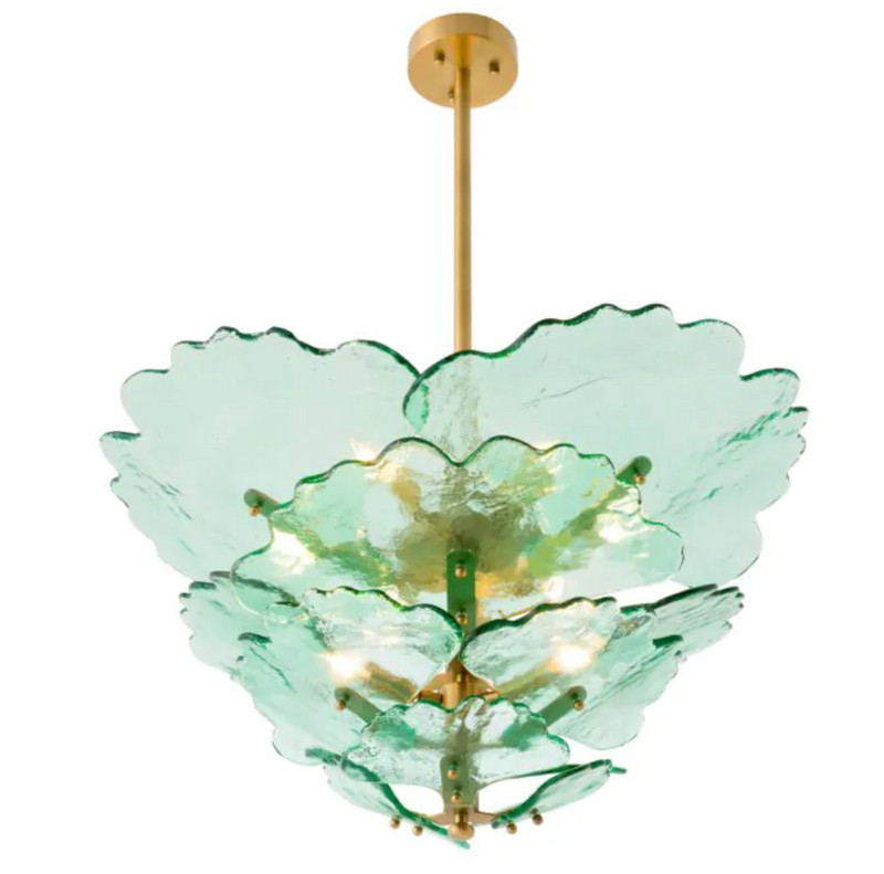 Führen Sie mit der Eichholtz Hängelampe Florina einen Farbhauch und Eleganz ein. Sein antikes Messing-Finish umrahmt das handgefertigte grüne Glas wunderschön und bietet eine organische Ästhetik, die jeden Raum aufwertet. Mit Maßen von Ø 83 cm und H. 54 cm fügt sich dieser Kronleuchter perfekt in großzügige Räume ein und verleiht Ihrem Zuhause einen Hauch von Eleganz und Stil.