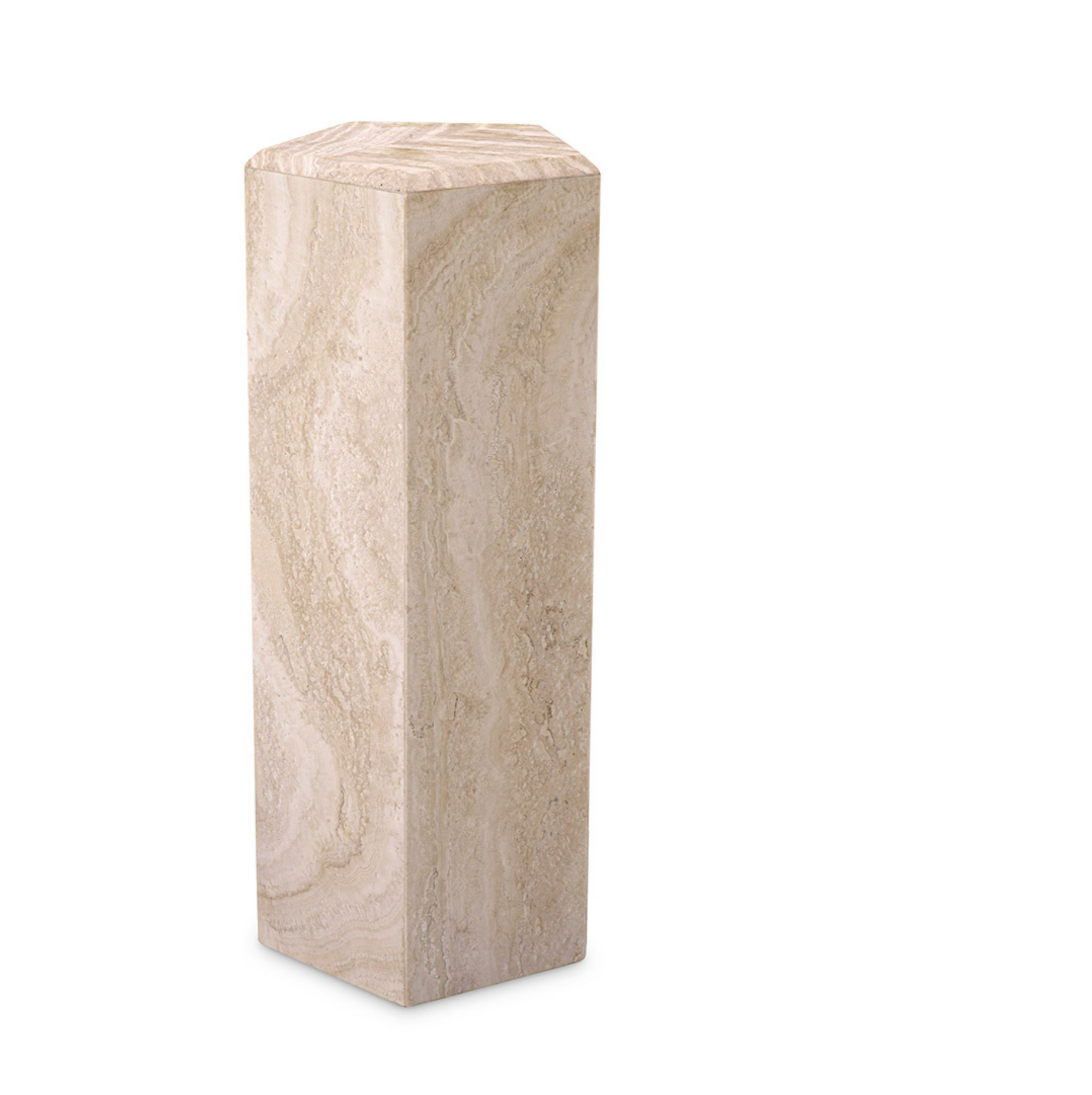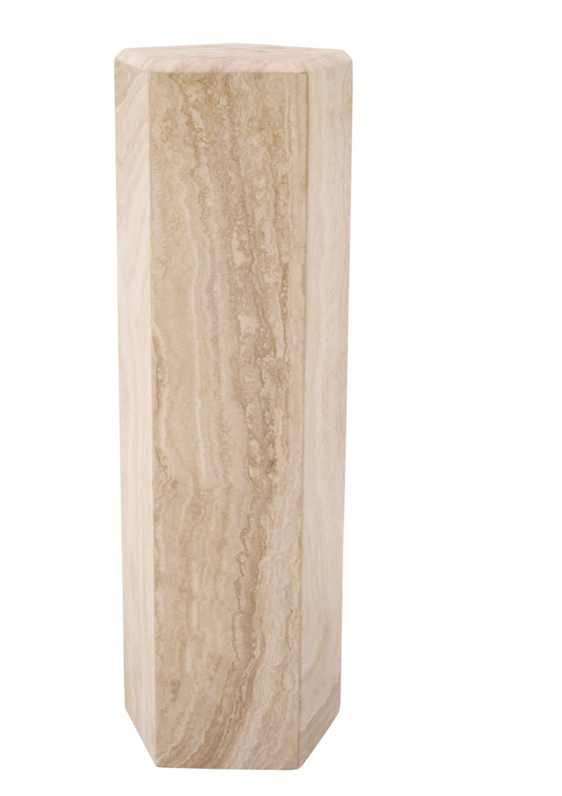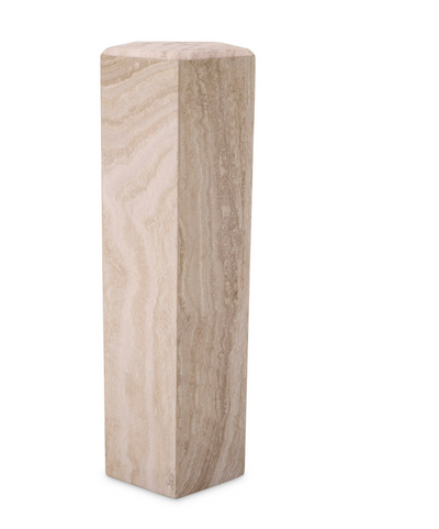 "Die majestätische Säule Cuneo L aus Travertin verkörpert die zauberhafte Schönheit dieses natürlichen Materials. Jede Säule ist handgefertigt und zeichnet sich durch einzigartige Variationen in Farbe und Textur aus, was sie zu einem einzigartigen Statement-Stück macht. Mit ihrer zeitlosen Anziehungskraft verleiht die Säule Cuneo L jedem architektonischen Setting Raffinesse und organischen Charme."