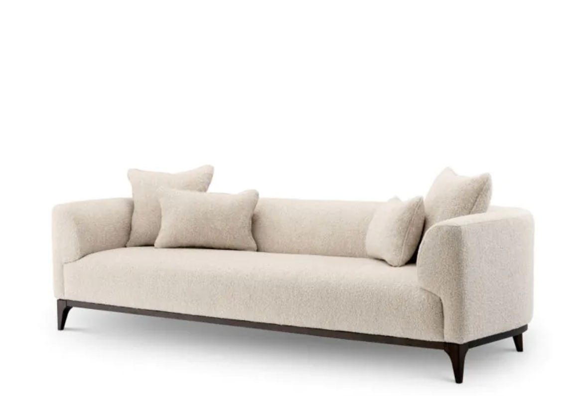 Das Sofa Brannan von Eichholtz verbindet modernen Luxus mit Komfort. Der Bouclé-Stoff in Chalk White und die elegante braune Holz-Basis schaffen ein stilvolles Ambiente. Mit großzügigen Maßen von 263 cm Breite und 92 cm Tiefe bietet es optimalen Platz für Entspannung im Wohnzimmer oder Lounge-Bereich.