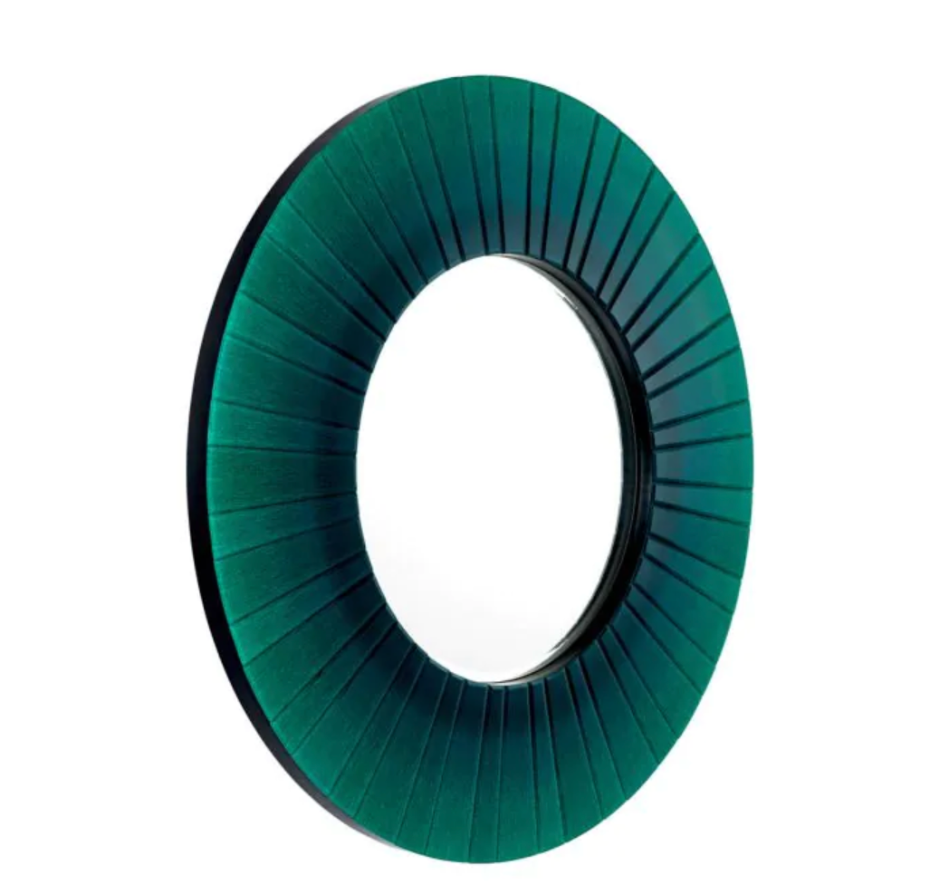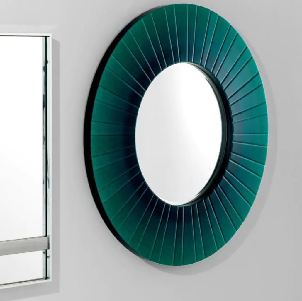 - Design und Stil: Runder, gewölbter Innenspiegel mit smaragdgrünem Glasrahmen und abgeschrägten Kacheln