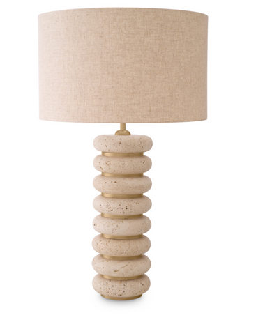 "Verleihen Sie Ihrem Interieur einen Hauch von stilvollem und zusätzlichem Licht mit der Tischlampe Baron von Eichholtz. Der Sockel aus skulpturalem Travertin und der Messing-Finish-Sockel, gekrönt von einem Leinenmix-Schirm, macht die Lampe ideal für Schlafzimmer, Lounges und andere Wohnbereiche."