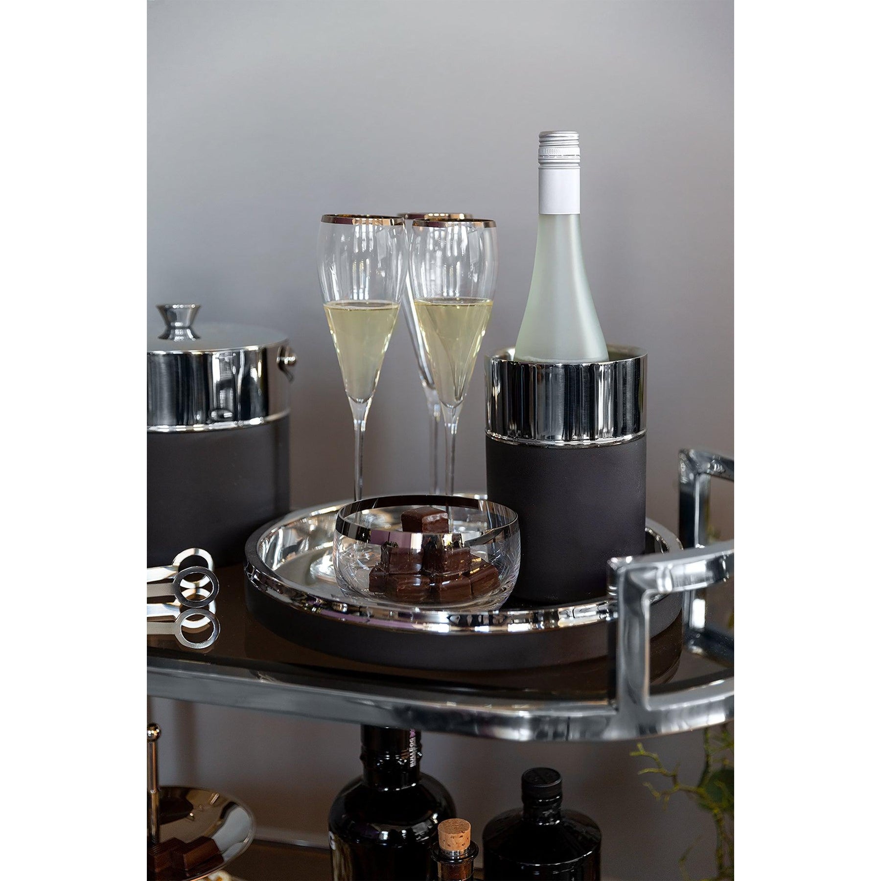 Ob geschüttelt oder gerührt: Mit dem Bar- und Cocktailset ANDOR servieren Sie Drinks auf stilvolle Art. Zeitlose Formensprache und hochwertige Metallveredelung prägen den modernen Look dieser Baraccessoires. Der Kontrast zwischen glänzend polierter Oberfläche und der mattschwarzen Beschichtung verleiht dem Barset eine besonders exklusive Note und macht es zu einem hochwertigen Bestandteil moderner Tischkultur. Das Set – bestehend aus Eisbehälter, Weinkühler, Cocktailshaker, Tablett und Punchbowl – ist aus pflegeleichtem, lebensmittelgeeigneten Edelstahl gefertigt und garantiert Ihnen ganz besondere Genussmomente für die Sinne. Jedes einzelne Stück wird in aufwendiger, traditioneller Handarbeit gefertigt und es entstehen individuelle Unikate, die ihre ganz eigene Herstellungsgeschichte besitzen.
