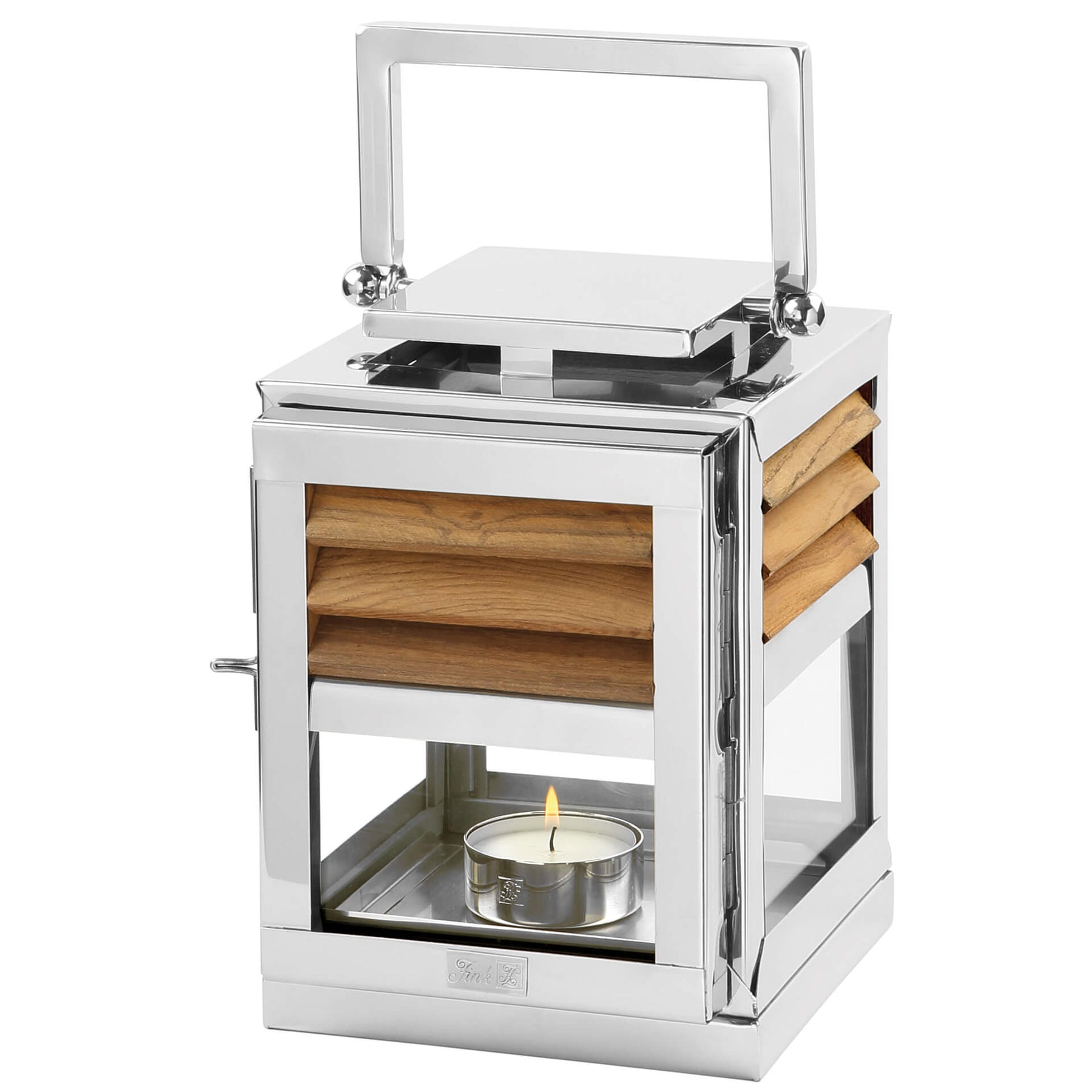Ein Wohnaccessoire voller Kontraste und raffinierter Details: Die Laternen aus der Serie GENUA beeindrucken mit unverwechselbarem Design, einer klaren Formensprache und einer aufregenden Materialkombination aus glänzendem Edelstahl und hochwertigem Teakholz. Klare Glaseinsätze schützen das Innere des Windlichtes und sorgen für ein ruhiges und sicheres Brennen der Flammen. Ein dekorativer Edelstahlbügel erleichtert das Umsetzen und Platzieren. Bringen Sie mit Kerzenlicht Wohlfühlatmosphäre in Ihr Zuhause und setzen Sie auf geschmackvolle Weise gemütliche Lichtakzente: In fünf unterschiedlichen Größen erhältlich bieten die Laternen Platz für fantasievolle Kerzenarrangements und enthalten ihre Wirkung sowohl als Solitär als auch in Kombination miteinander.