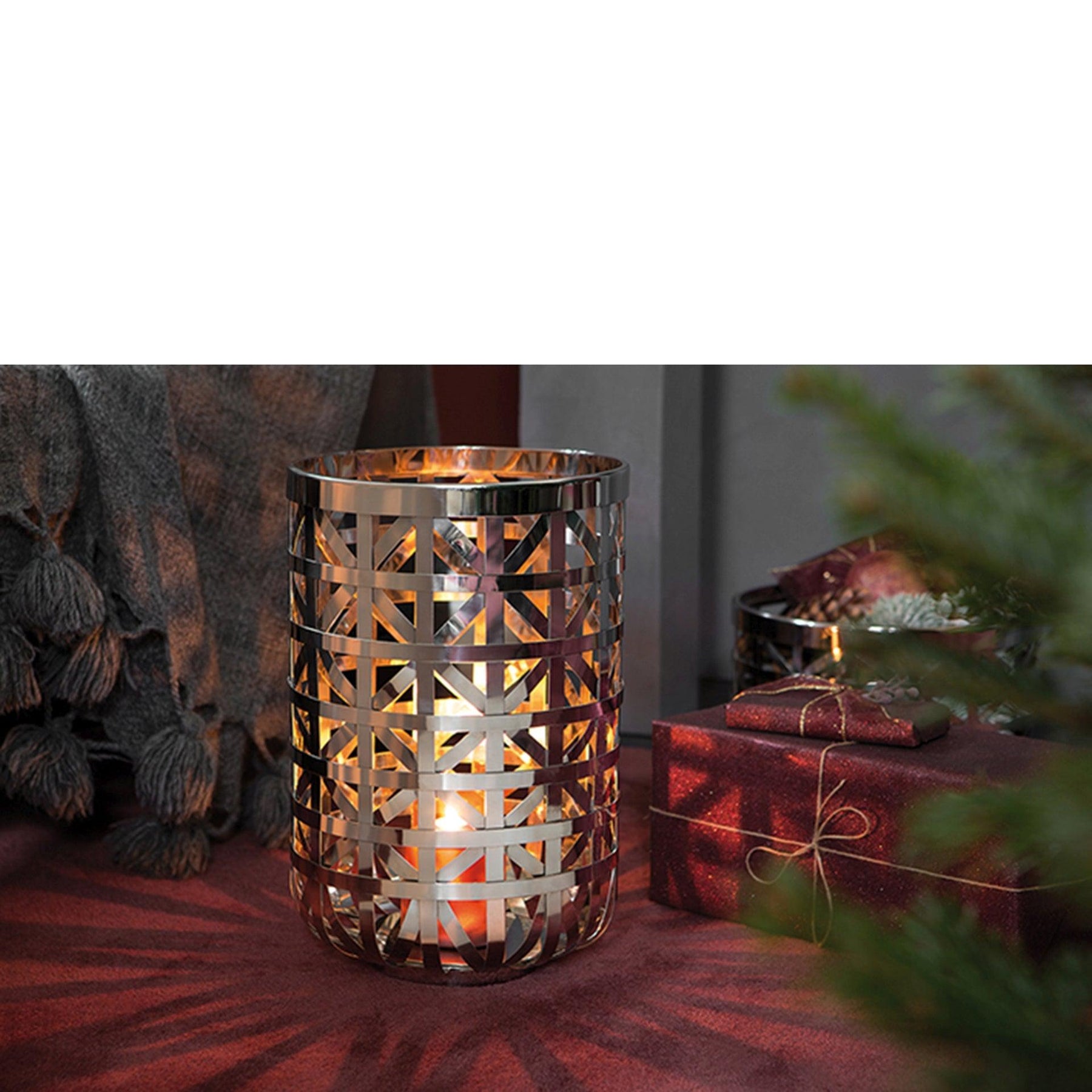 Das Windlicht JORIS garantiert mit seiner geordneten Struktur für faszinierende Lichteffekte. Gradlinig geometrisch und trotzdem verspielt passt es ganzjährig und saisonübergreifend in jeden modernen Dekorations-und Einrichtungstil. Der robuste und langlebige Edelstahl beeindruckt mit wundervollem Glanz, der das Kerzenlicht reflektiert und mit schimmerndem Zauber zum Träumen einlädt. Damit das Windlicht optimal zu Ihren Ansprüchen passt sind vier unterschiedliche Varianten für den Innen-und Außenbereich erhältlich. Für die beiden Modelle mit größerem Durchmesser verwandelt ein passender Kerzenhalteraufsatz das Windlicht in einen einzigartigen Lichterkranz.