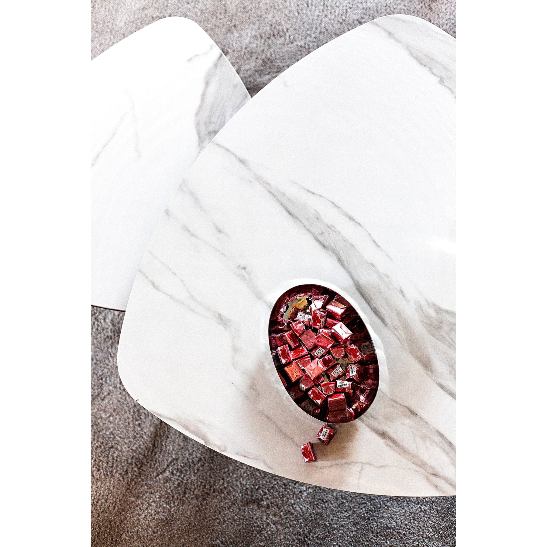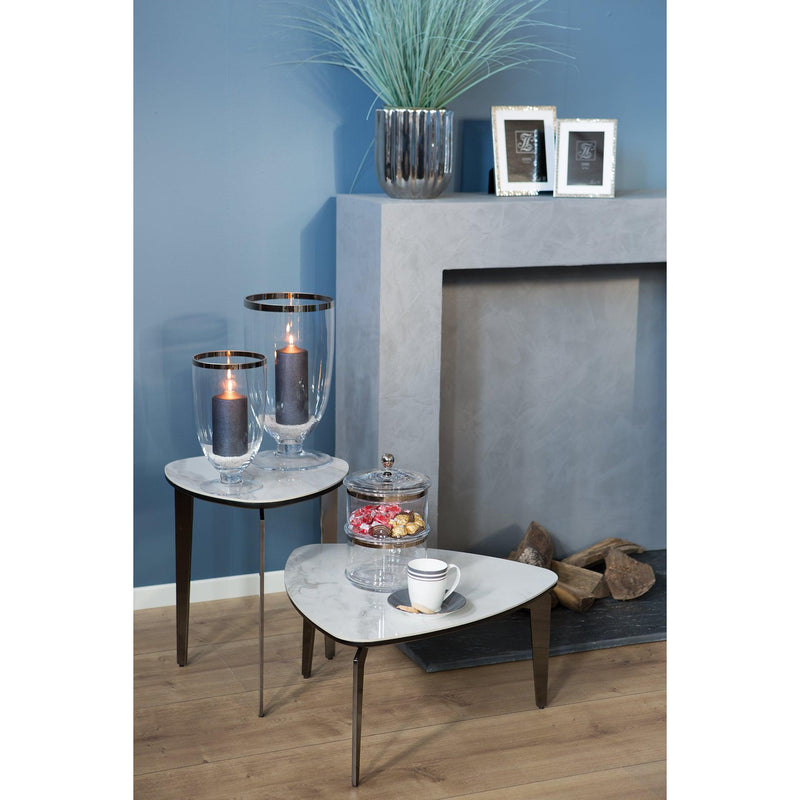 Die unverwechselbare Optik von Marmor gehört zu den zeitlosen Wohnakzenten, die nie aus der Mode kommen. Mit ihren individuellen Mustern und dem rauen Charme bringen Oberflächen im Marmorlook Natürlichkeit, Leben und einen Hauch von Luxus in jedes Interieur. In Kombination mit dem einzigartigen Fink Living-Design entstehen so kleine Möbel-Schmuckstücke, die die exklusive und persönliche Note Ihres Zuhauses unterstreichen: Moderne Formensprache, klare, geometrische Linien und der außergewöhnliche Kontrast, der zwischen der Steinoptik der Oberflächen und den hochwertigen Fußteilen aus dunkelgrau vernickeltem Metall entsteht, lassen alle Tischvarianten zu charmanten Akzenten in jedem Wohnbereich werden.