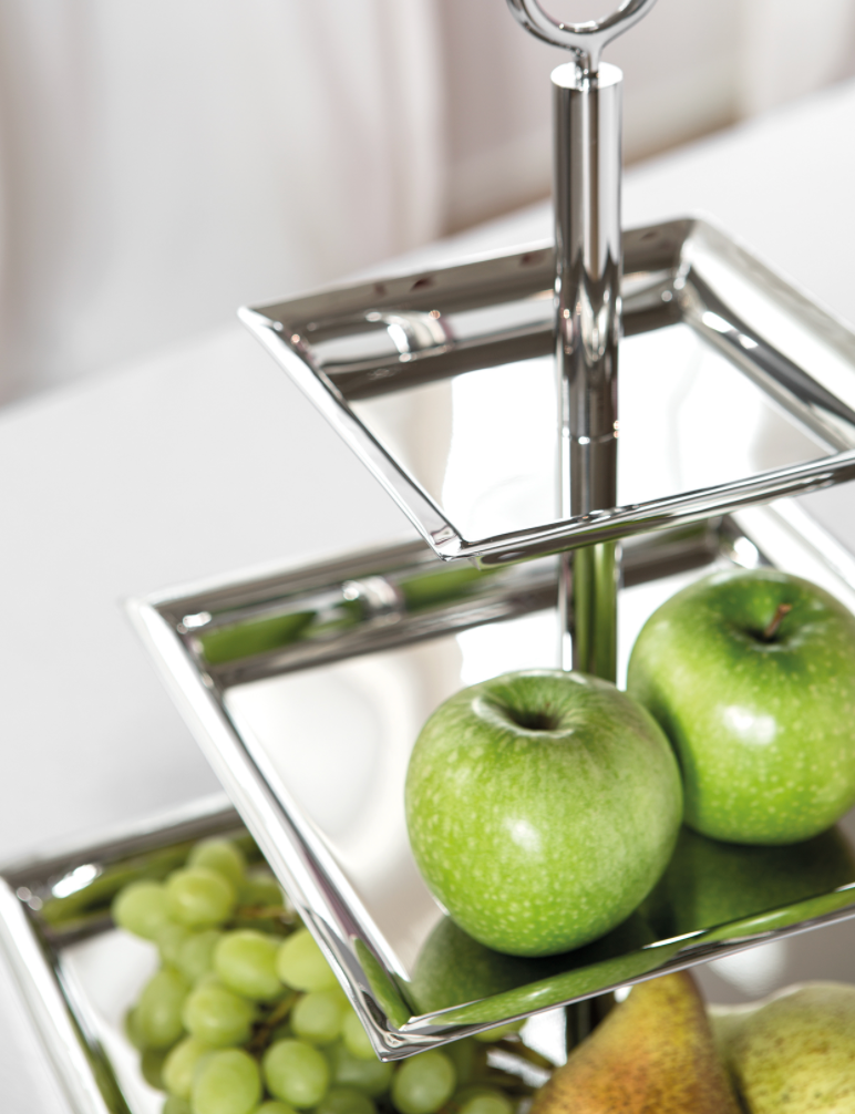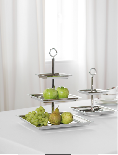 Die Etagere ist ein wahrer Klassiker. Schon vor hunderten von Jahren wurden sie genutzt um kleine Köstlichkeiten anzupreisen und bis heute haben sie nichts von ihrem außergewöhnlichen Charme eingebüßt. Bringen Sie mit der Etagere NAGANO einen Hauch von traditioneller Tischkultur in ihr Zuhause. Gefertigt aus robustem und lebensmittelechtem Edelstahl eignen sie sich auch für das Servieren von Speisen und für den Einsatz auf Buffets hervorragend. Dekoriert mit frischem Obst oder einem Blumenarrangement werden sie im Nu zu einem vielseitigen und schlichtem Dekoaccessoire, das mit jedem Wohn- und Einrichtungsstil harmoniert.
