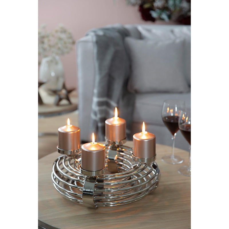 Der Adventskranz gehört zu den traditionellsten Weihnachtsdekorationen. Woche für Woche lässt er die Vorfreude auf das große Fest steigen und sorgt mit wärmendem Kerzenschein für stimmungsvolles Flair in jedem Zuhause. Der Kerzenhalter MODENA begeistert mit seinem klaren Design aber nicht nur in seiner Funktion als Adventskranz, sondern erfreut über die Weihnachtszeit hinaus ganzjährig mit dezenter Eleganz. Aus hochglänzendem und pflegeleichtem Edelstahl gefertigt und mit austauschbaren Haltern für opulente Stumpenkerzen bestückt ist er ein wandelbares und vielseitiges Dekorationsaccessoire. Optional erhältliche Glaszylinder runden die charmante Optik des Kerzenhalters MODENA ab. Wählen Sie aus zwei unterschiedlichen Größen Ihren neuen Blickfang.