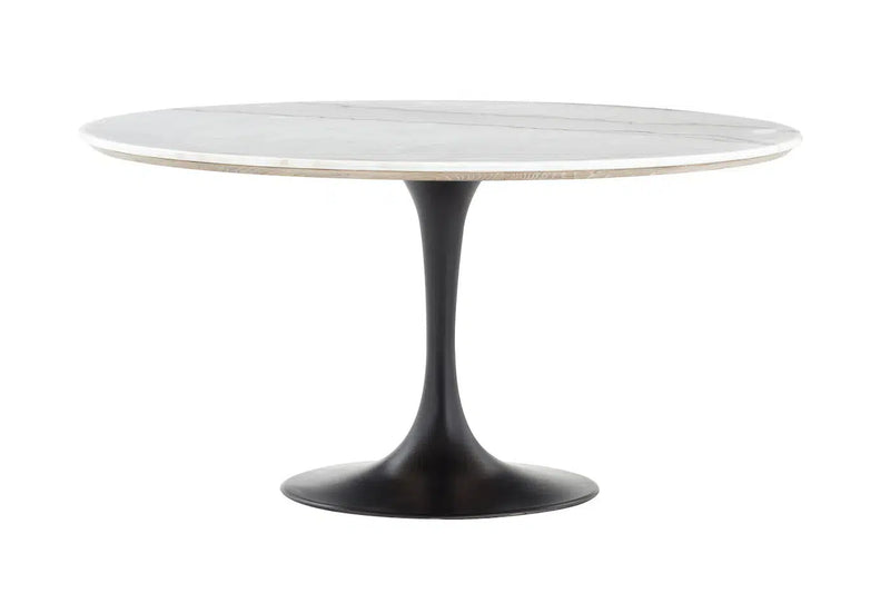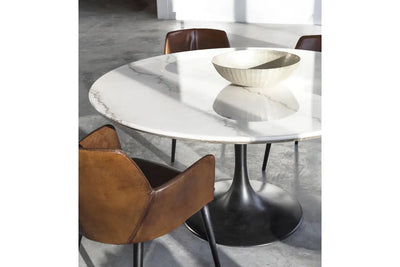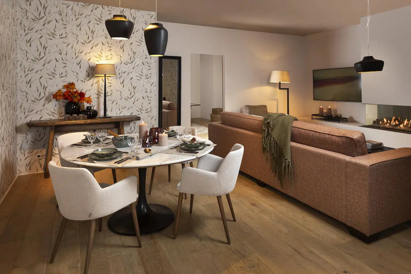 Moderner Minimalismus mit einem Hauch von Retro: Der Aboah ist so viel mehr als ein Esstisch. Er hat nur ein Tischbein, das elegant in einen robusten runden Fuß übergeht. Ein Design-Modell für extra viel Beinfreiheit. Dank des schwarzen Unterteils und der luxuriösen Tischplatte von Flamant aus Eichenholz und Marmor lässt sich der Aboah problemlos mit Metall-, Leder- und Holzstühlen kombinieren. Es ist serviert!