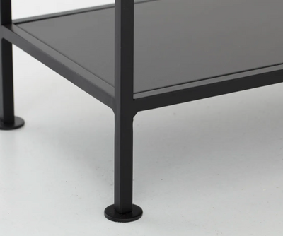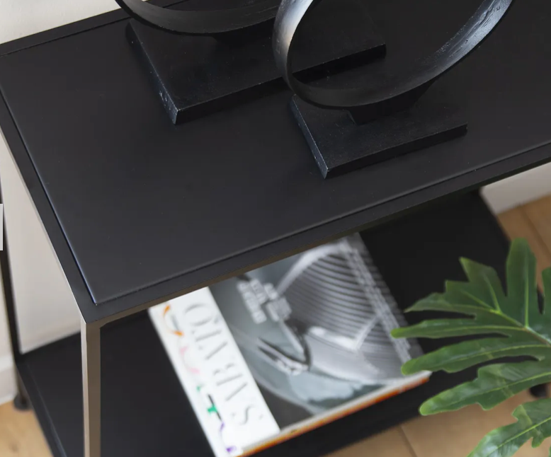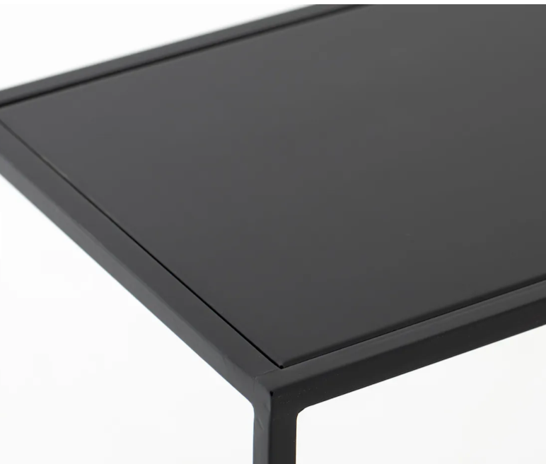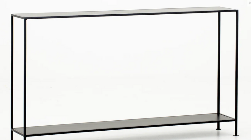 Der elegante Konsolentisch Cosa ist nach einem modernen Entwurf aus Schmiedeeisen gefertigt. Ein linearer, in verblasstem Gold gehaltener Korpus umschließt zwei pechschwarze Eisentabletts. Das vom Art-déco-Stil inspirierte Design hat auf den ersten Blick eine strenge, geometrische Ausstrahlung, das Antikfinish verleiht dem Stück jedoch eine gewisse Feinheit. Mit seinen schlichten, dezenten Formen passt dieses durchdachte Möbelstück zu jeder Inneneinrichtung.