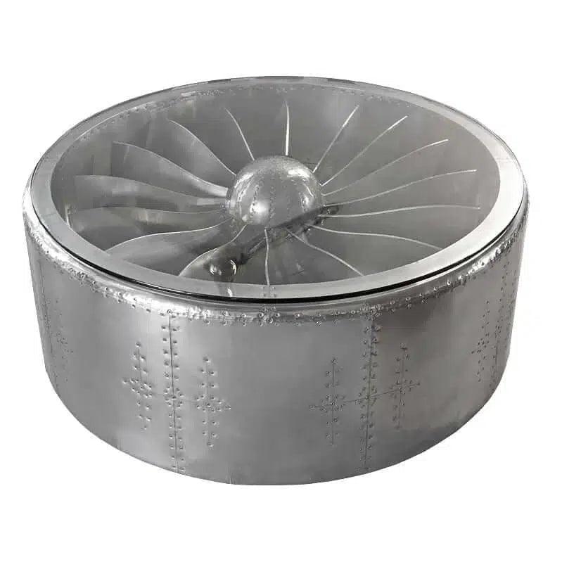 Mit dem Hazenkamp Airplane Sofa Table holen Sie sich die Faszination der Fliegerei direkt ins Wohnzimmer. Dieser exklusive Couchtisch im markanten Flugzeugturbinen-Design ist nicht nur ein Möbelstück, sondern ein echtes Sammlerstück. Die Basis aus genietetem Aluminium erinnert an die ikonischen Formen klassischer Flugzeugtriebwerke. Eine runde Glasplatte gibt den Blick frei auf detailgetreue Turbinenschaufeln im Inneren – ein faszinierendes Zusammenspiel aus Technik und Eleganz. Ob im Wohnzimmer, Loft oder Showroom: Dieser Tisch ist ein Statement für Stilbewusstsein und Luftfahrtbegeisterung.