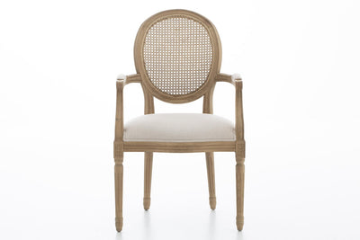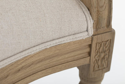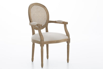 Ein klassischer Esszimmerstuhl im zeitlosen Vintage-Look gepaart mit modernem Komfort. Eine Rückenlehne aus handgewebtem Wiener Geflecht und ein Sitzpolster aus 100 % Leinen werden elegant von handgeschnitzter Eiche umrahmt. Noch mehr Stilgefühl versprühen die geschwungenen Stuhlbeine mit ihren floralen Ornamenten.