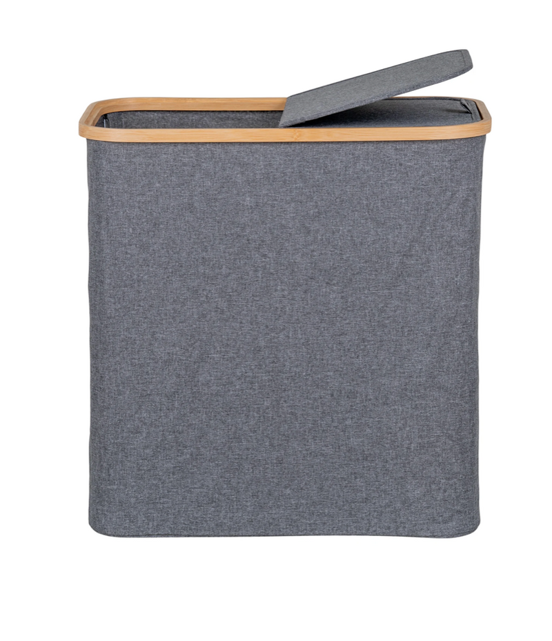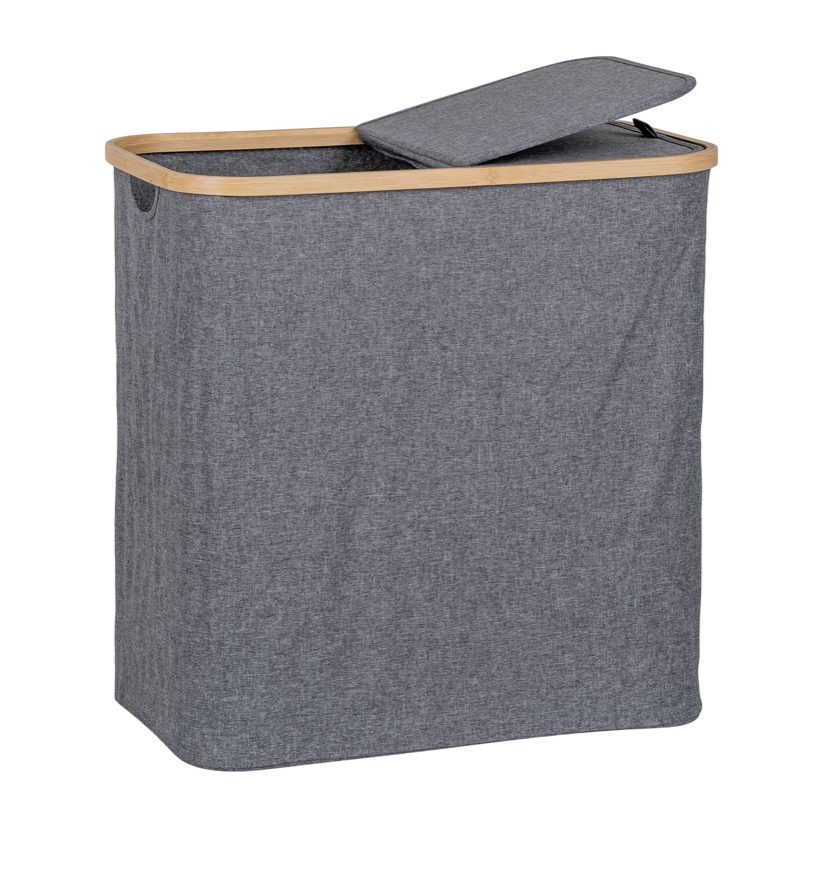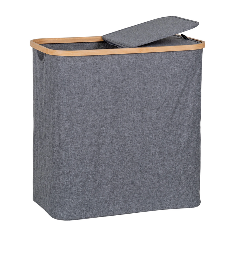 Der Matera Aufbewahrungskorb Reha kombiniert Funktionalität und Ästhetik perfekt. Dieser Wäschekorb aus robustem Bambus und strapazierfähigem Polyester überzeugt mit seiner modernen dunkelgrauen Farbgebung. Mit großzügigen Abmessungen von 54x33x54 cm bietet er ausreichend Platz für Wäsche und passt gleichzeitig stilvoll in Schlafzimmer, Badezimmer oder Waschküche