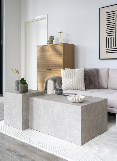 - Material & Farbe: MDF mit Dekorpapier, Marmoroptik in Beige