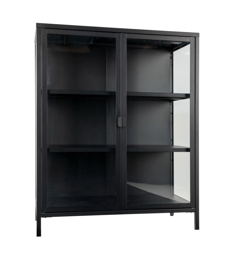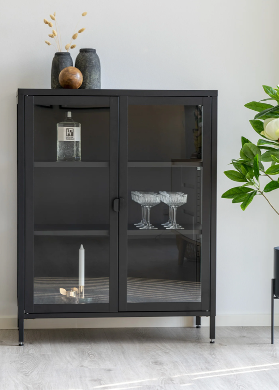 - Design und Stil: Vitrine mit 2 Glasfronttüren und schwarzen Metallbeinen