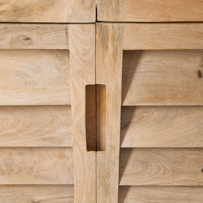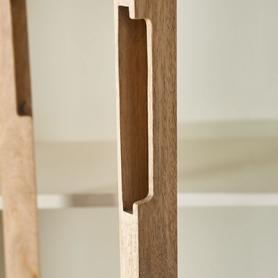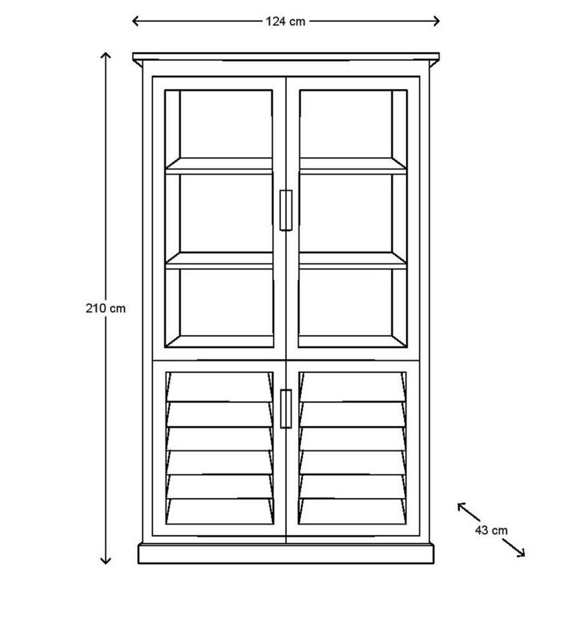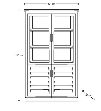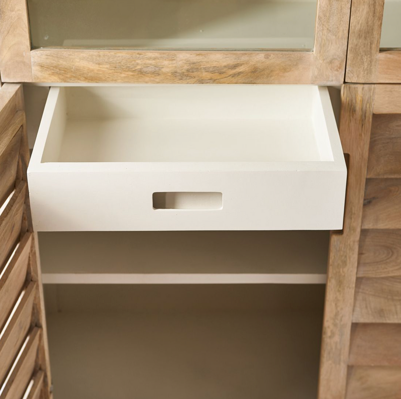 Ein rundum komplettes Möbelstück von Riviera Maison. Ein Modell mit stattlichen Abmessungen, daher lässt sich viel in diesem Schrank unterbringen, ohne dass er aus den Fugen gerät. Zwei große Glastüren mit drei großzügigen Ablageflächen dahinter, über eine Gesamtbreite von 124 cm. Darunter befinden sich kleine Lamellentüren mit zwei weiteren Ablageflächen. Und zwei Schubladen, gut versteckt, aber durchaus griffbereit. Der 210 cm hohe Schrank ist aus Mangoholz gefertigt. Hübsch natürlich gehalten mit weißen Ablageflächen – ein echtes Schmuckstück für Ihre Inneneinrichtung.