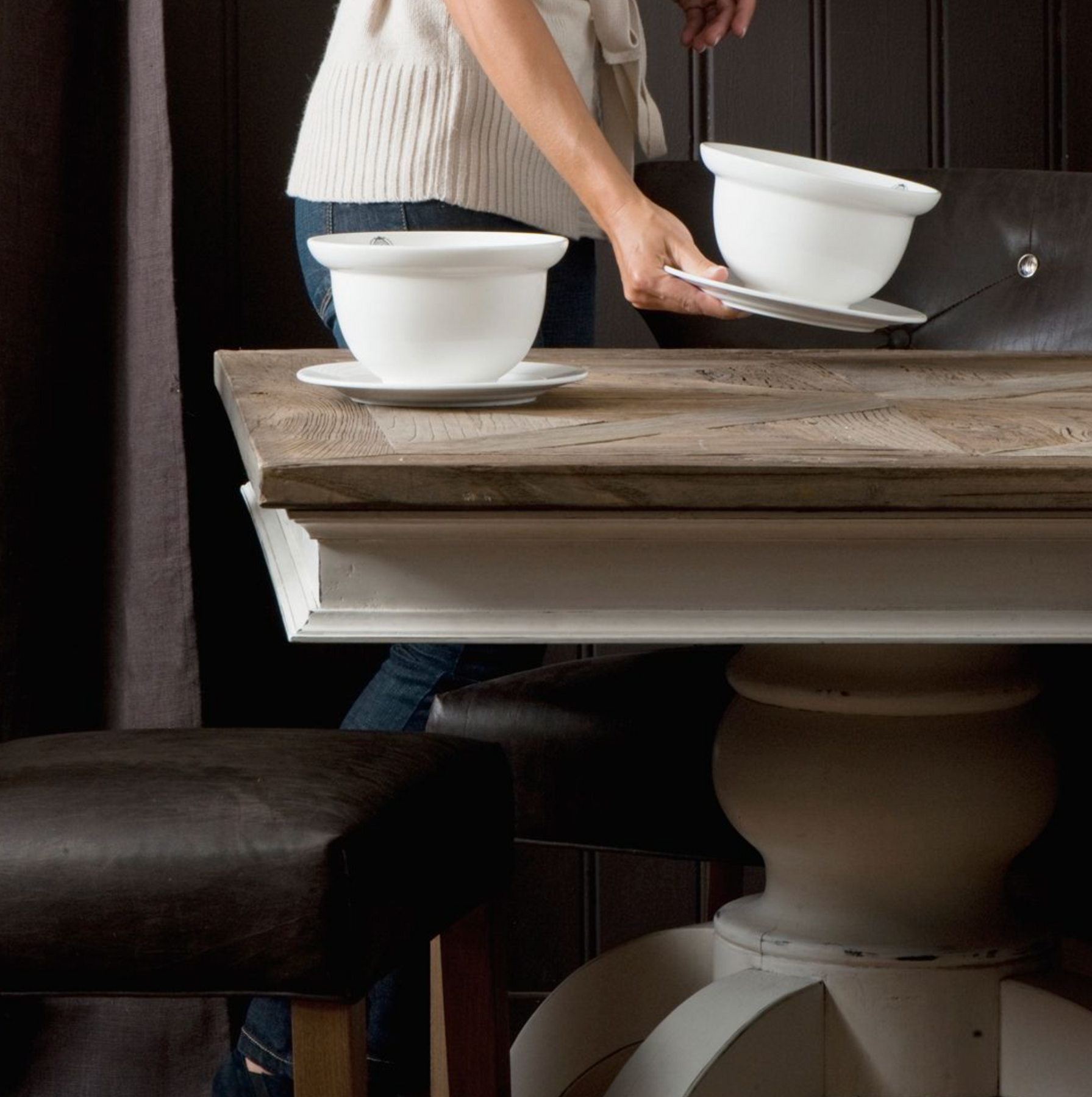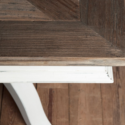 Die Château Belvédère Tischkollektion von Riviera Maison besticht durch ihre rustikale Eleganz und den Charme vergangener Zeiten. Die quadratischen Tischplatten aus recyceltem Ulmenholz zeichnen sich durch ihre einzigartige Maserung und antike Ausstrahlung aus. Das weiß gestrichene Gestell mit abgerundetem zentralen Tischbein und geschwungenen Füßen fügt dem Design eine nostalgische, aber zugleich zeitlose Note hinzu.