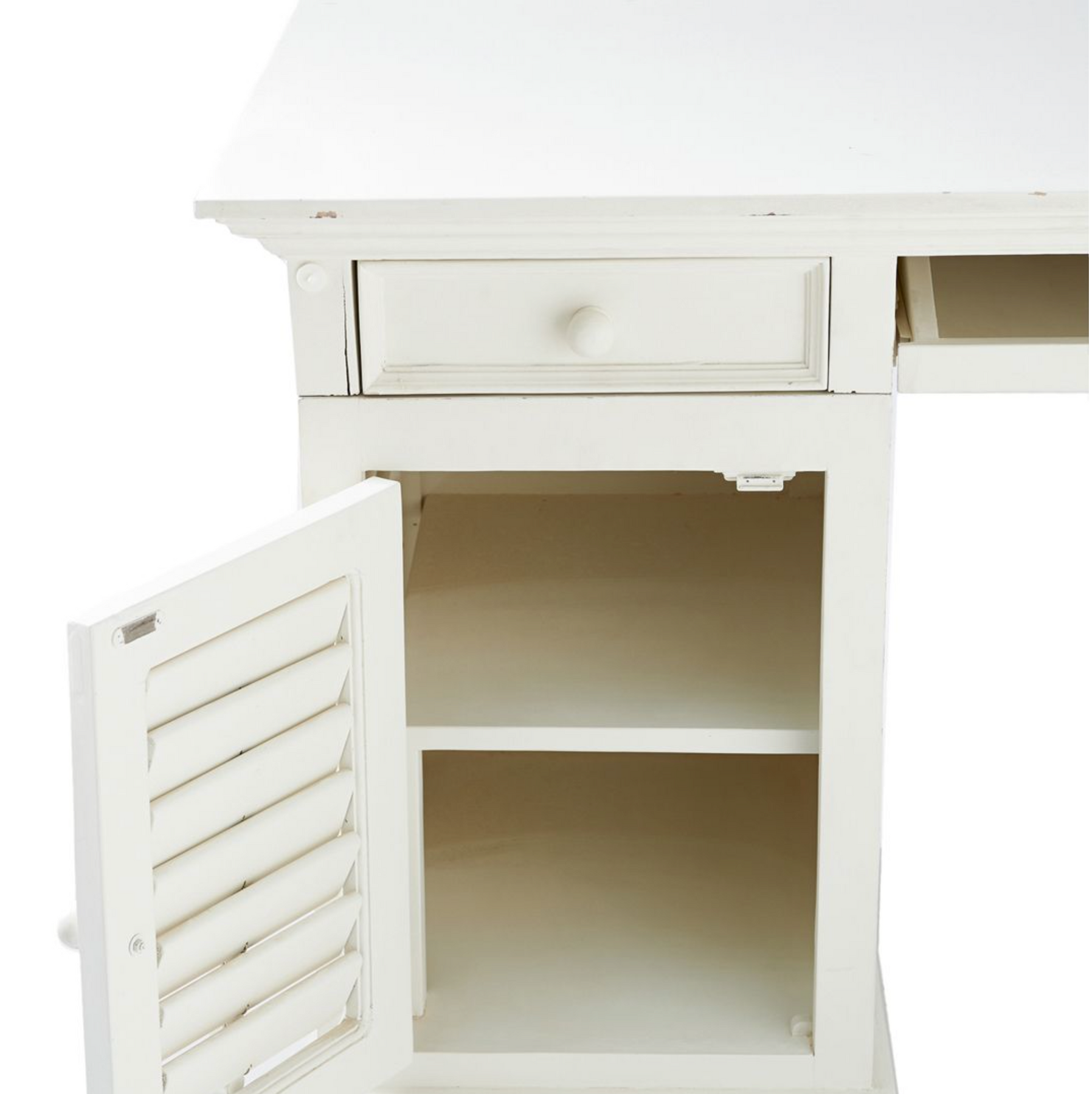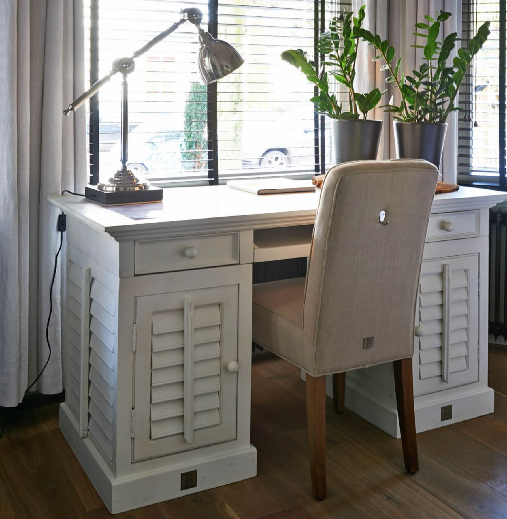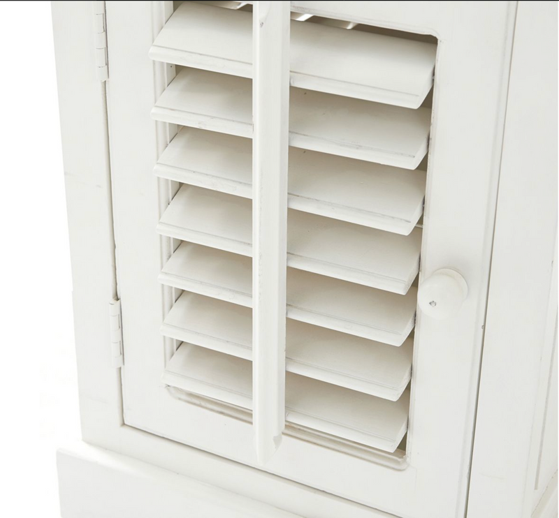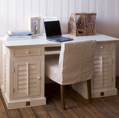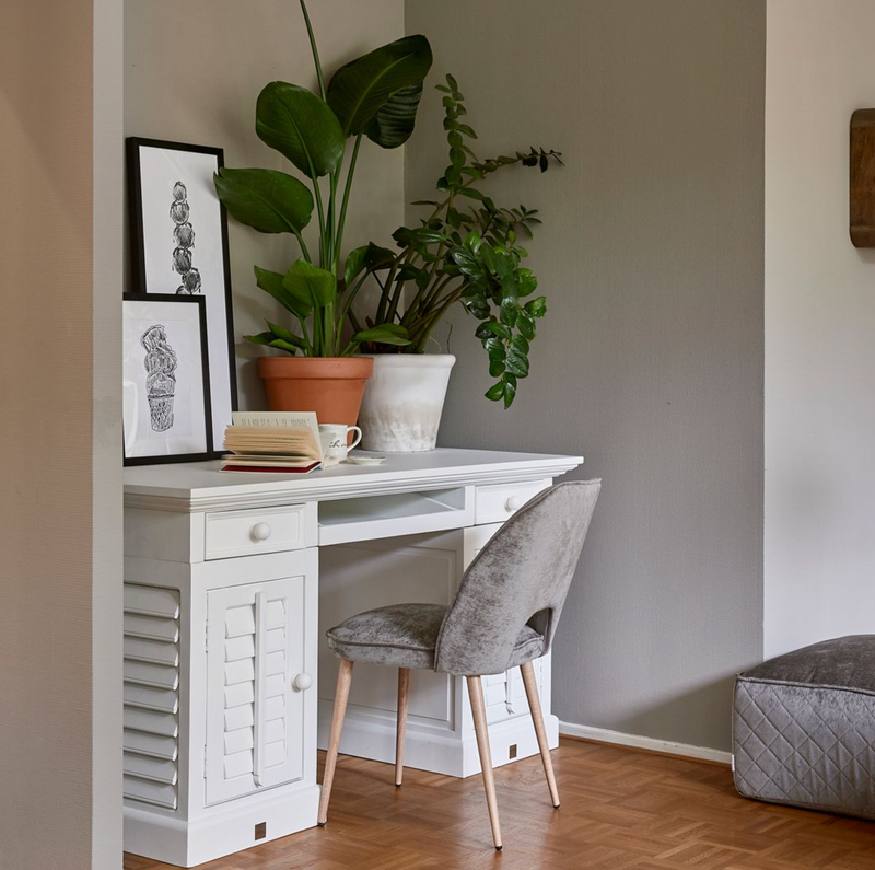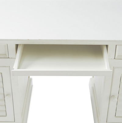 Der New Orleans Desk von Riviera Maison ist ein hübscher weißer Schreibtisch aus Akazienholz. Der Schreibtisch hat an beiden Seiten je zwei Schubladen, einen ausziehbaren Teil in der Mitte sowie Staufächer an beiden Seiten. Hinter der Lamellentür befindet sich an jeder Seite ein Bord. Hübsches Detail: Die Lamellen sind beweglich.