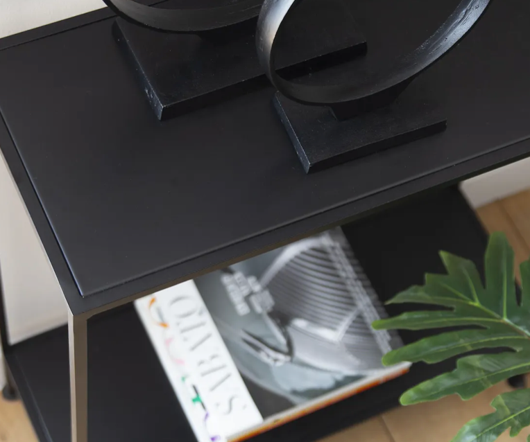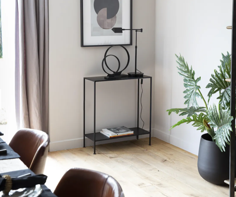 Элегантный консольный столик Cosa выполнен из кованого железа в соответствии с современным дизайном. Линейный корпус цвета потускневшего золота окружает два смоляных железных лотка. Дизайн, вдохновленный ар-деко, на первый взгляд имеет строгий, геометрический вид, но антикварная отделка придает предмету некую утонченность. Благодаря простым, сдержанным формам этот утонченный предмет мебели подойдет к любому дизайну интерьера.
