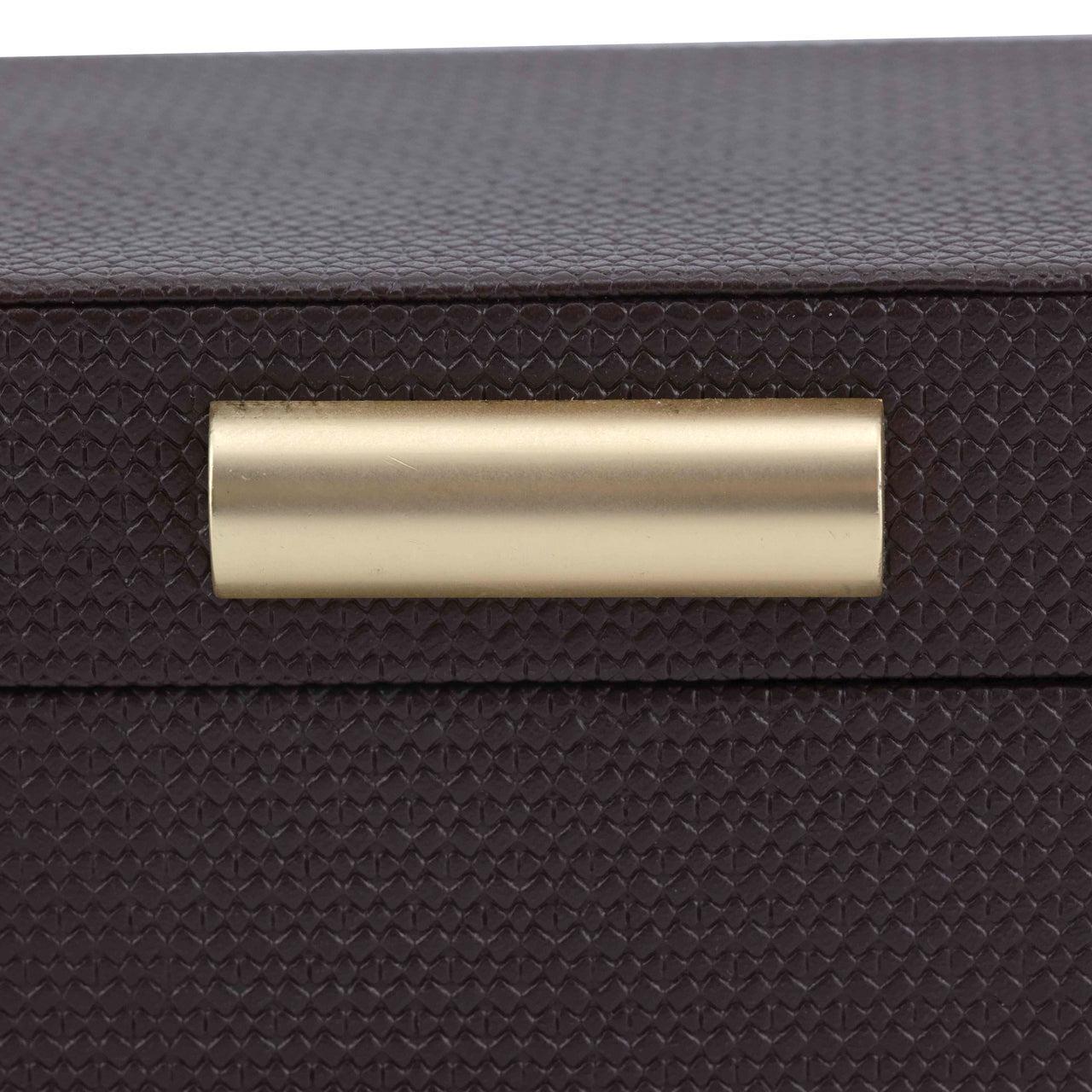Компактный ящик для хранения элегантного вида в теплых коричневых тонах. Утонченный дизайн делает их практичными и декоративными в современном интерьере. Идеально подходит для хранения мелких вещей.