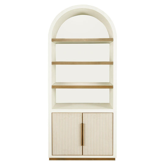 А Richmond Interiors Шкаф Tivoli (белый) впечатляет своим элегантным, современным дизайном с изогнутыми линиями и конструкцией открытой шельфа. Белые деревянные двери с дубовым шпоном и стабильными полками предлагают как место для хранения, так и привлекательную зону презентации. Благородные латунные акценты и надежное строительство из фанеры, железа и дуба -шпона делают этот шкаф элегантным предметом мебели для каждого дома.