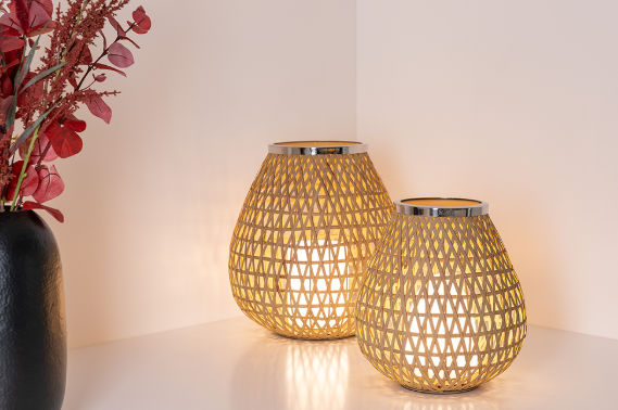 А Шона Фонарь впечатляют с мягкими формами, нежными земными тонами и тонкими плетеной деталями, которые обеспечивают уютную атмосферу. Блестящий металлический край устанавливает стильный контраст с естественным видом. Каждое произведение сделано в традиционной ручной работе, которая создает отдельные уникальные произведения. С размерами 26 x 26 x 27,5 см фонарь идеально подходит для больших осадных карт и создает волшебное настроение освещения после заката.