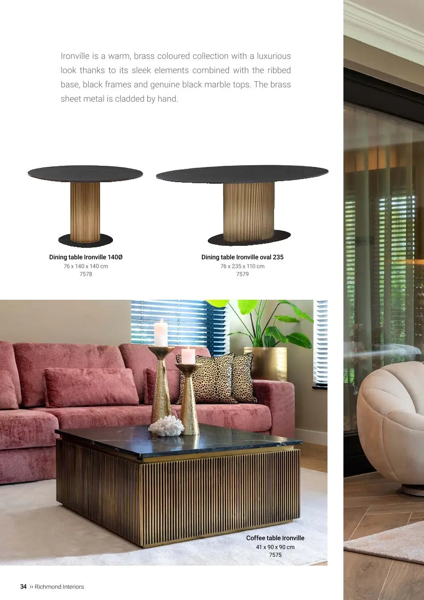 А Коллекция Ironville Выступает за роскошный дизайн и высококачественные материалы. С вашим элегантным Ребра мотива в латунное золото и Черные мраморные поверхности Установить стильные акценты в каждой комнате. Дизайн гофрированного золота в сочетании с черным Металлические ножки в Промышленный вид Создайте современную и эксклюзивную атмосферу.