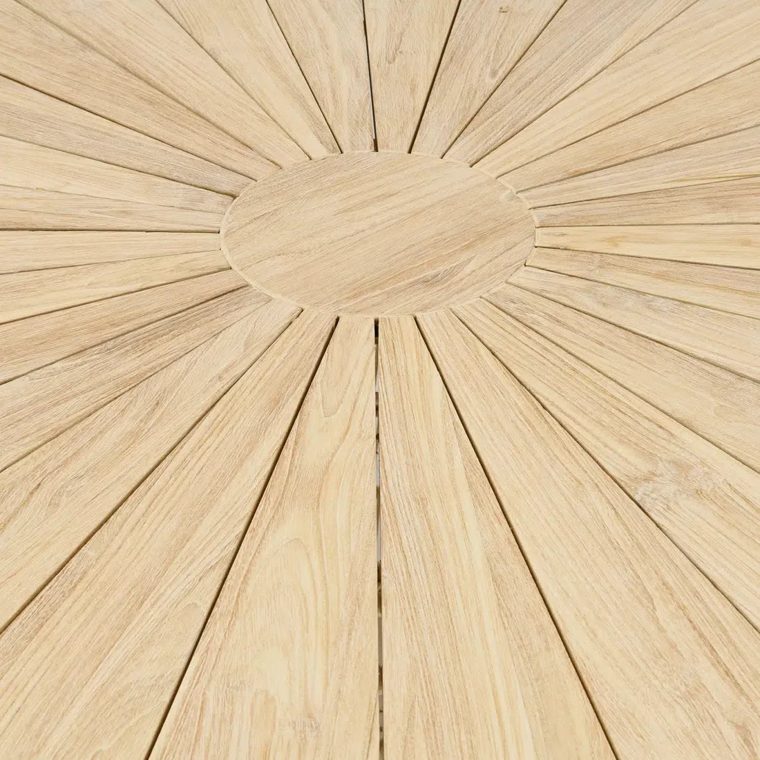Натуральная табличка из тикового стола идеально гармонизирует Яркие натуральные тона, бежевые и песчаные краскиПолем Объединить его с Нарученные стулья или кресла для отдыха Для роскошного отпуска.