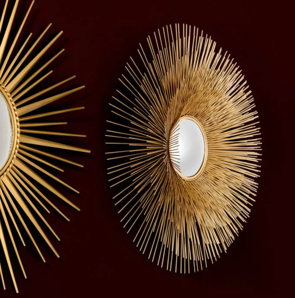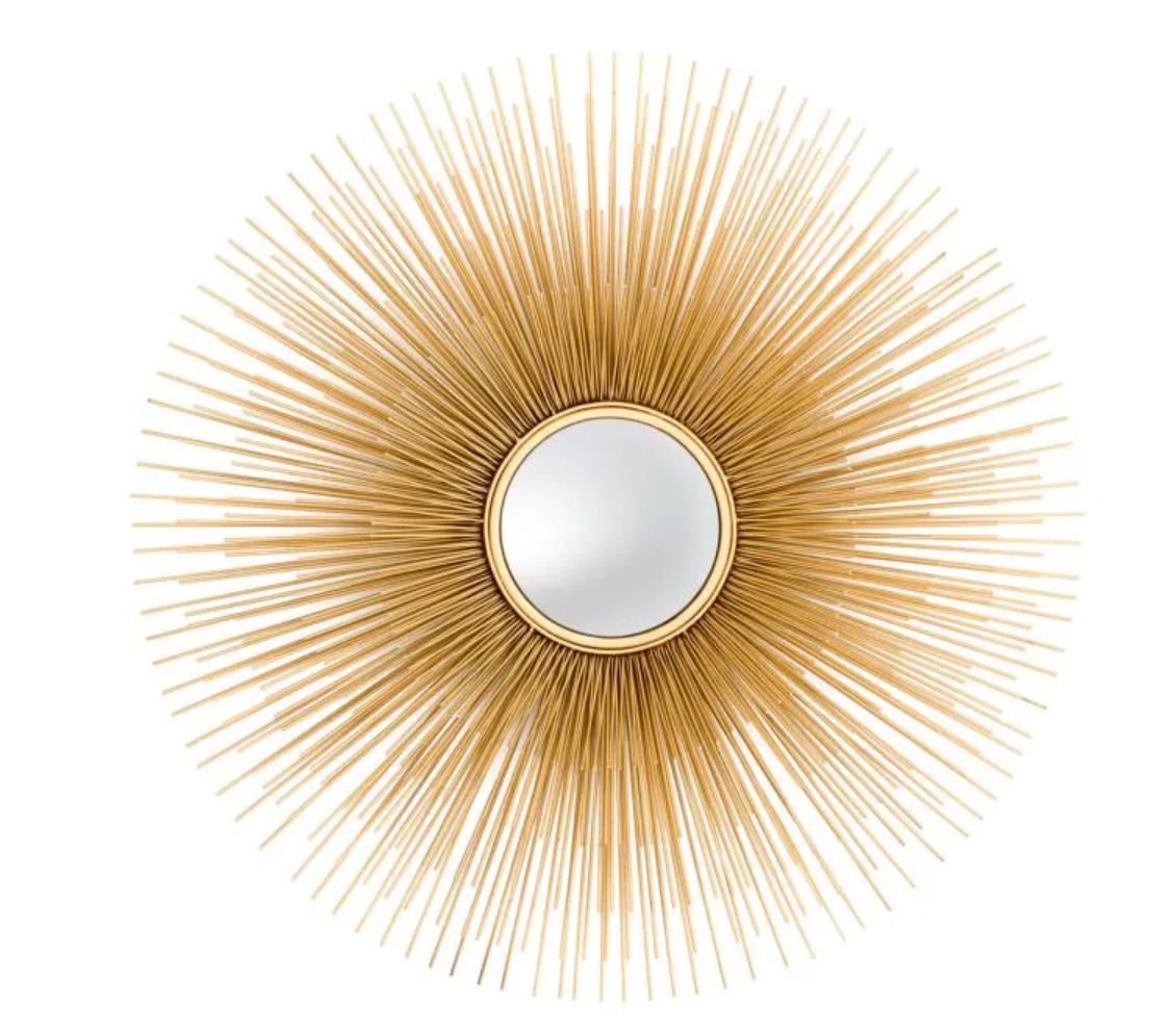 . Eichholtz Spiegel Solaris L, Versay Kalesi'nin güneş motiflerinden esinlenerek zamansız güzellik yayar. Çarpıcı, kavisli şekli ve parlak altın yüzeyi ile bu ayna gerçek bir tasarım simgesidir. Her odada göz alıcı olarak mükemmel olan iç mekana zarafet ve stil dokunuşu verir.